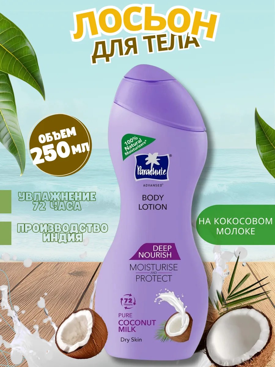 Лосьон для тела с кокосовым молочком-отличное средство по уходу за кожей тела. Увлажняет кожу, смягчает ее, придает бархатистость. Лосьон для тела Parachute Advanced с кокосовым молоком имеет лёгкую текстуру и быстро впитывается в кожу, делая её мягкой и шелковистой без чувства липкости. Обогащенный кокосовым молокоми 100% натуральными увлажнителями, он сохраняет мягкость и эластичность кожи в течении всего дня! Обладает приятным лёгким ароматом. Это настоящее спасение для сухой кожи зимой! Создан на основе новой прорывной формулы, специально разработанной для очень сухой кожи. Обогащен кокосовым молоком и 100% натуральными увлажняющими компонентами. Глубоко проникает в кожу, обеспечивая интенсивное увлажнение и питание даже в самую холодную погоду. Способ применения: нанесите необходимое количество лосьона на чистую кожу тела, распределите массажными движениями до полного впитывания.