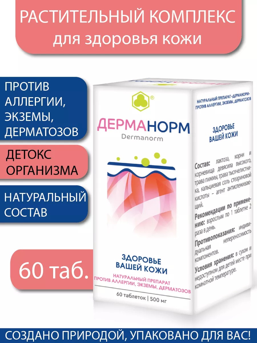 Дерманорм – концентрированный витаминно-минеральный продукт, изготовленный на основе натуральных компонентов, снабжающих организм веществами, необходимыми для комплексного очищения организма, стабильной работы ЖКТ и улучшения состояния кожи. Способствует выведению токсинов, балластных веществ, паразитов и продуктов их жизнедеятельности. Оказывает пребиотическое, антиаллергическое, противомикробное, общеукрепляющее и антиоксидантное действие. Корневища с корнями девясила высокого – источник ценного полисахарида инулина, который стимулирует восстановление полезной микрофлоры кишечника, избавляя от множества проблем пищеварения: предотвращает развитие гнилостных процессов в кишечнике, способствует купированию воспалительных реакций, улучшает обмен веществ, ускоряет клеточную регенерацию, укрепляет иммунитет. Будучи пищевым волокном, инулин механически очищает кишечник, способствуя выведению токсичных веществ, вызывающих проблемы с кожей. Девясил обладает выраженным антипаразитарным эффектом. Трава тысячелистника обыкновенного – источник целого ряда биоактивных соединений, в совокупности благотворно влияющих на состояние кожи. Комплекс дубильных веществ, органических кислот и природной формы витамина К обеспечивает противовоспалительное, вяжущее, ранозаживляющее действие растения, избавляя от зуда и шелушения кожи в волосистой части головы, уменьшая интенсивность угревых высыпаний на лице и теле. Эфирное масло тысячелистника обладает бактерицидным, антипаразитарным и противоаллергическим свойствами, улучшает работу печени, способствует очищению крови от токсических веществ, что также положительно сказывается на состоянии кожи. Трава пижмы обыкновенной обладает противолямблиозным, антигельминтным, желчегонным, спазмолитическим и вяжущим свойствами. Эффективно устраняет воспаление органов желудочно-кишечного тракта, стимулирует моторику желчного пузыря, улучшая отхождение желчи. Улучшает снабжение тканей организма кислородом, одновременно нейтрализуя действие свободных радикалов, способствуя замедлению процессов старения, помогая сохранять кожу свежей, чистой и упругой. Рекомендуется: для очищения, питания, оздоровления кожи;для нормализации работы печени и органов ЖКТ; для очищения организма от токсичных веществ и защиты от канцерогенов;для уничтожения патогенных микроорганизмов и паразитов; для улучшения состояния кишечной микрофлоры и профилактики дисбактериоза; при работе на вредном производстве или проживании в местности с неблагоприятной экологической обстановкой;при хронических заболеваниях печени и органов ЖКТ для профилактики обострений; для стабилизации обменных процессов; для укрепления антиоксидантной и иммунной систем организма. Взрослым по 1 таблетке 2 раза в день. Количество лактозы, входящей в состав таблеток, как вспомогательное вещество, не оказывает отрицательного влияния на людей с сахарным диабетом и страдающих непереносимостью лактозы.