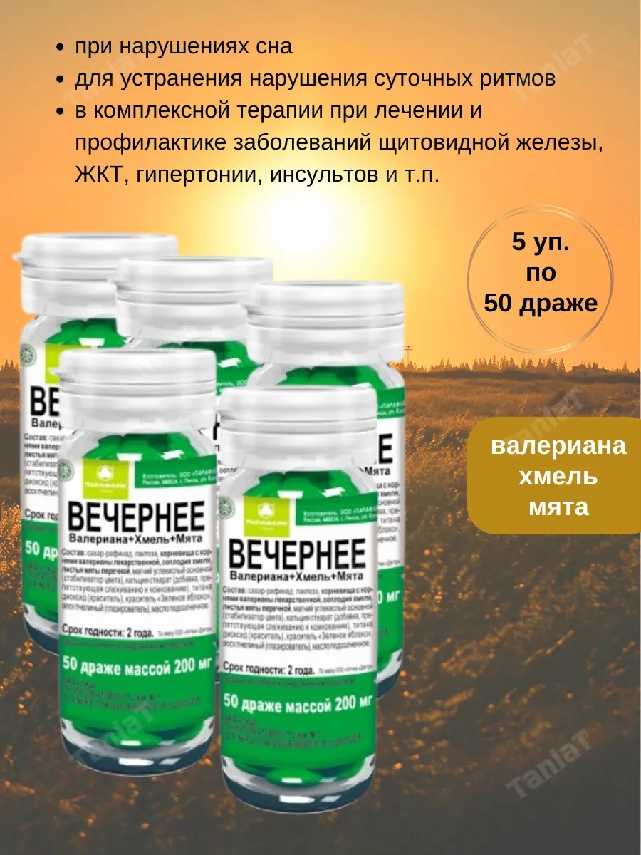 | Комплектация | вечернее валериана+хмель+мята n50 драже; 5уп |