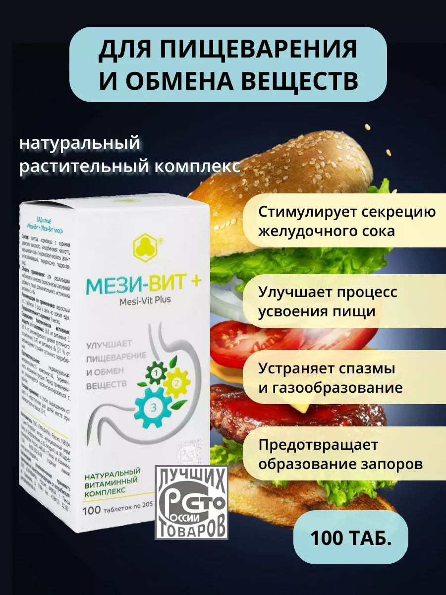 Натуральный препарат на основе девясила высокого, созданный для поддержания и восстановления нормальной работы пищеварительной системы и печени, восстановления обмена веществ без риска желчных камней. Мези-Вит Плюс отличается мягким стимулирующим и корректирующим действием на желудочно-кишечный тракт. Улучшая пищеварение, он также способствует полноценному усвоению из пищи необходимых организму нутриентов, а значит – активизации обмена веществ. Стимулирует выработку пищеварительных ферментов; оказывает противовоспалительное, ранозаживляющее, желчеобразующее и желчегонное действие. Рекомендуется для улучшения процессов пищеварения; профилактики и в комплексной терапии гастрита, панкреатита, холецистита, язвенной болезни желудка и двенадцатиперстной кишки и других заболеваний желудочно-кишечного тракта; при нарушениях режима питания. Свойства КОМПОНЕНТОВ: ДЕВЯСИЛ высокий является одним из лучших регуляторов деятельности желудочно-кишечного тракта. Корни девясила содержат значительное количество (до 44%) инулина и инуленина, улучшающих обмен углеводов и жиров, снижающих уровень сахара в крови. Инулин относится к группе пищевых волокон, является пребиотиком. Особое эфирное масло, которое содержится исключительно в этом растении (до 4%), обладает бактерицидным действием, подавляет воспаление в кишечнике. Стимулирует секрецию желудочного сока, улучшает процесс усвоения пищи, обеспечивает нормальное кровоснабжение органов пищеварительной системы, возбуждает аппетит, устраняет спазмы в кишечнике, предотвращает образование запоров. Стабилизирует работу печени и желчного пузыря. Обладает диуретическим и желчегонным свойствам, способствуя скорейшему выведению из организма всевозможных токсинов и шлаков. Хорошо зарекомендовал себя девясил также, как обезболивающее противоаллергическое, антимикробное и антигельминтное средство. ВИТАМИН С добавлен в продукт для улучшения выработки пищеварительных ферментов, а также в качестве антиоксиданта и капилляропротектора. ВИТАМИН В6 стимулирует образование и выведение желчи, улучшает детоксикационную работу печени. В препарате используются цельные части растений, а не экстракты из них. При производстве концентрата применяется технология криообработки, что позволяет добиться максимальной сохранности всех действующих веществ и лучшего измельчения, а значит – более эффективного усвоения действующих веществ. Способ применения: по 2–3 таблетки 3 раза в день во время еды. Курс – 1 месяц. При необходимости повторить курс для получения устойчивого результата.