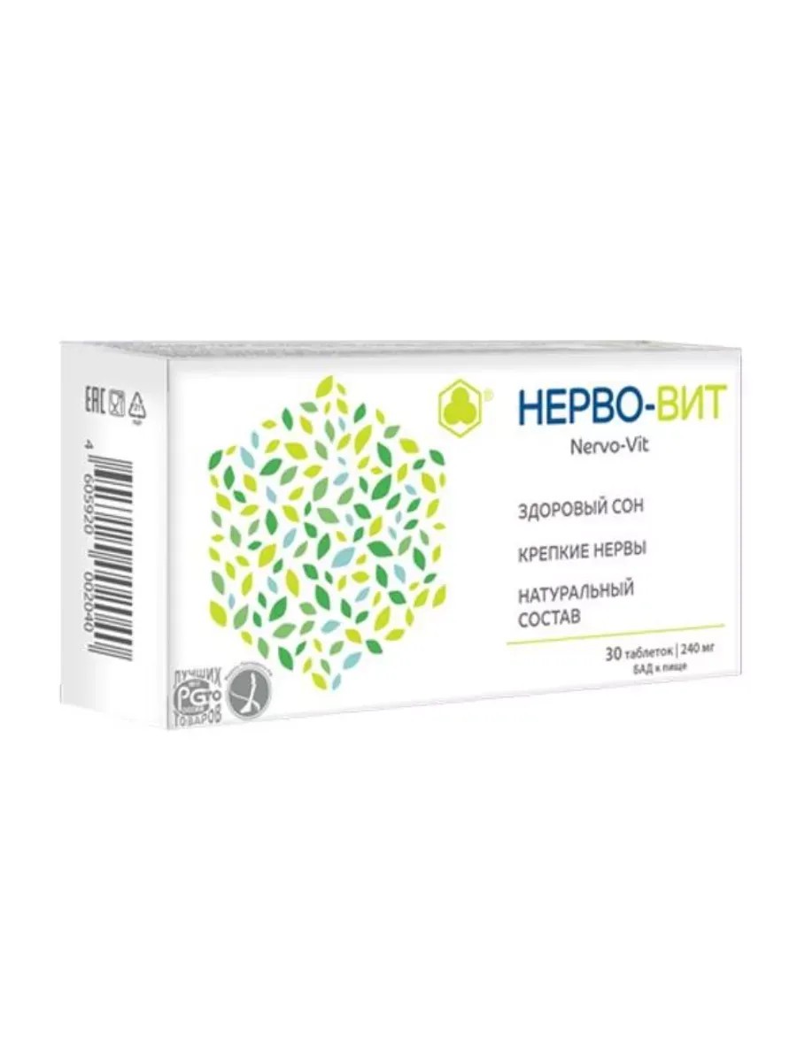 Встречайте \Нерво-вит №30 Крио-Формула Успокоения\ – революционный продукт от компании \Парафарм\, созданный для обеспечения внутреннего спокойствия и гармонии. Наша криоформула позволяет сохранить все жизненно важные вещества лекарственных растений, обеспечивая максимальную эффективность и быстрое действие.\n\nСостав на одну таблетку (240 мг):\n\nКорневища с корнями синюхи голубой (криопорошок) – 10 мг\nЭкстракт мелиссы лекарственной – 10 мг\nКорневища с корнями валерианы лекарственной (криопорошок) – 25 мг\nЭкстракт пустырника сердечного – 10 мг\nАскорбиновая кислота (витамин C) – 8 мг\nОсновные преимущества:\n\nУникальный состав с применением криотехнологии для сохранения целительной силы растений.\nСертифицированный HDBA органик комплекс для нормализации работы нервной системы.\nБезопасность применения: не вызывает привыкания, не влияет на когнитивные функции.\nПродукт подтвердил свою эффективность в клинических исследованиях.\nРекомендации по применению: \Нерво-вит №30\ рекомендован для тех, кто сталкивается с повышенной нервной возбудимостью, стрессами и нарушениями сна. Он поможет вам чувствовать себя уравновешенным и спокойным каждый день.\n\nСпособ применения и дозы: Принимать взрослым по 2–3 таблетки 3 раза в день во время еды. Курс приема составляет 2 недели. При необходимости возможно повторение курса.\n\n\Нерво-вит №30\ – это не просто БАД, это ваш ежедневный помощник для поддержания психоэмоционального баланса и здоровья нервной системы. Обратите внимание, что данный продукт не является лекарственным средством и перед его применением рекомендуется проконсультироваться с врачом.