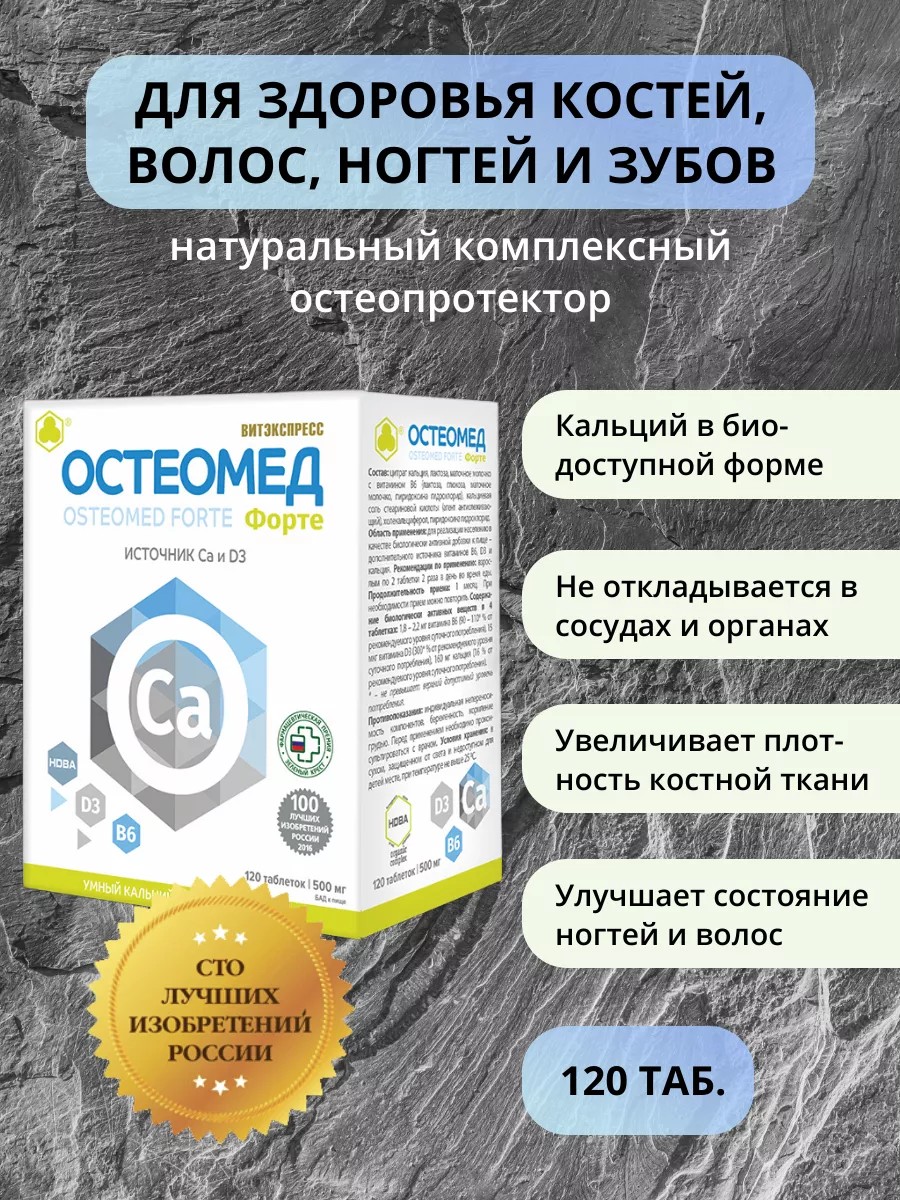 Остеомед Форте – всё, что нужно для укрепления костной системы. Это остеопротектор нового поколения, эффективный и безопасный одновременно. Внесён Федеральной службой по интеллектуальной собственности РФ (Роспатентом) в реестр «100 лучших изобретений России». Способствует регуляции кальциево-фосфорного обмена, положительно влияет на состояние костной системы. Нормализует гормональный фон, что необходимо для восстановления структуры костной ткани, повышения ее плотности особенно в период менопаузы и постменопаузы. Подавляет разрушение клеток костной ткани, способствует выработке коллагена. Благотворно воздействует на минеральный обмен, направляя кальций не в сосуды и мягкие ткани, а на костеобразование. Новизна и ПРЕИМУЩЕСТВА: 1. Укрепление скелета и защита от переломов без побочных эффектов, типичных для кальцийсодержащих средств. 2. Комплекс содержит кальций в форме цитрата, обладающего высокой степенью усвоения и безопасным для желудочно-кишечного тракта. 3. В отличие от препаратов, которые просто наполняют организм кальцием, препарат дополнительно содержит компоненты, способствующие естественному усвоению кальция костной тканью. Ключевой компонент препарата – трутневый гомогенат – витаминно-минеральный коктейль высокой биологической ценности. Это уникальный продукт переработки личинок пчелиных трутней, разработанный и запатентованный компанией «Парафарм». Компонент стимулирует выработку наиболее значимого для костеобразования гормона тестостерона. Его принципиальным отличием от гормонозамещающих лекарств является стимулирующее, а не подавляющее действие на собственное производство гормонов. Свойства компонентов: Гомогенат ТРУТНЕВО-РАСПЛОДНЫЙ способствует повышению уровня андрогенов, что улучшает ремоделирование костных тканей. Аминокислоты, входящие в его состав, участвуют в формировании коллагена и костной матрицы. Цитрат КАЛЬЦИЯ является эффективной и безопасной формой кальция, полностью всасываемой ЖКТ. Предотвращает резорбции костной ткани, увеличивает минеральную плотность костной массы. ВИТАМИН D3 участвует в формировании костной ткани, способствует усвоению кальция, магния и фосфора и отвечает за уменьшение потери этих веществ с мочой через почки. Необходим для нормальной минерализации и роста костей. Активно способствует росту скелета, укреплению мышц и минерализации костей и зубов. ВИТАМИН В6 помогает усвоению магния и кальция, препятствуя нарушению кальциевого обмена. Помогает удерживать кальций. Препятствует камнеобразованию в почках, принимает участие в синтезе женских половых гормонов. РЕКОМЕНДУЕТСЯ при остеопении и остеопорозе и для предупреждения их развития; переломах для ускорения из заживления и профилактики повторных травм; артрите, артрозе, остеохондрозе, пародонтите и остеопорозе; женщинам в менопаузе для повышения уровня половых гормонов, от которых зависит здоровье костной и хрящевой ткани; перед протезированием зубов; при нехватке в качестве кальция, витаминов Д3 и В6. Способ применения: по 2 таблетки 2 раза в день сублингвально (под язык). Для профилактики: по 2 таблетки вечером. Курсовой приём — 6 мес. с перерывом 5-10 дней после каждого месяца приёма.