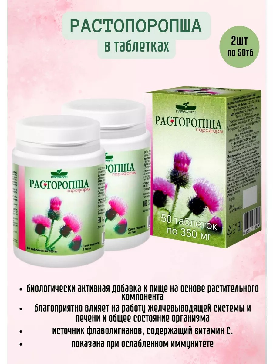 Расторопша-парафарм - это биологически активная добавка к пище на основе растительного компонента. Каждая упаковка содержит 100 таблеток, массой 350 мг. Рекомендуется использовать препарат в качестве дополнительного источника флаволигнанов, содержащей витамин С, которые благоприятно влияют на работу желчевыводящей системы и печени, а также на общее состояние организма. При этом является безопасным и не имеет серьезных побочных эффектов. Расторопша-Парафарм оказывает противовоспалительное, слабительное, гемостическое, желчегонное, гепатопротекторное действие.