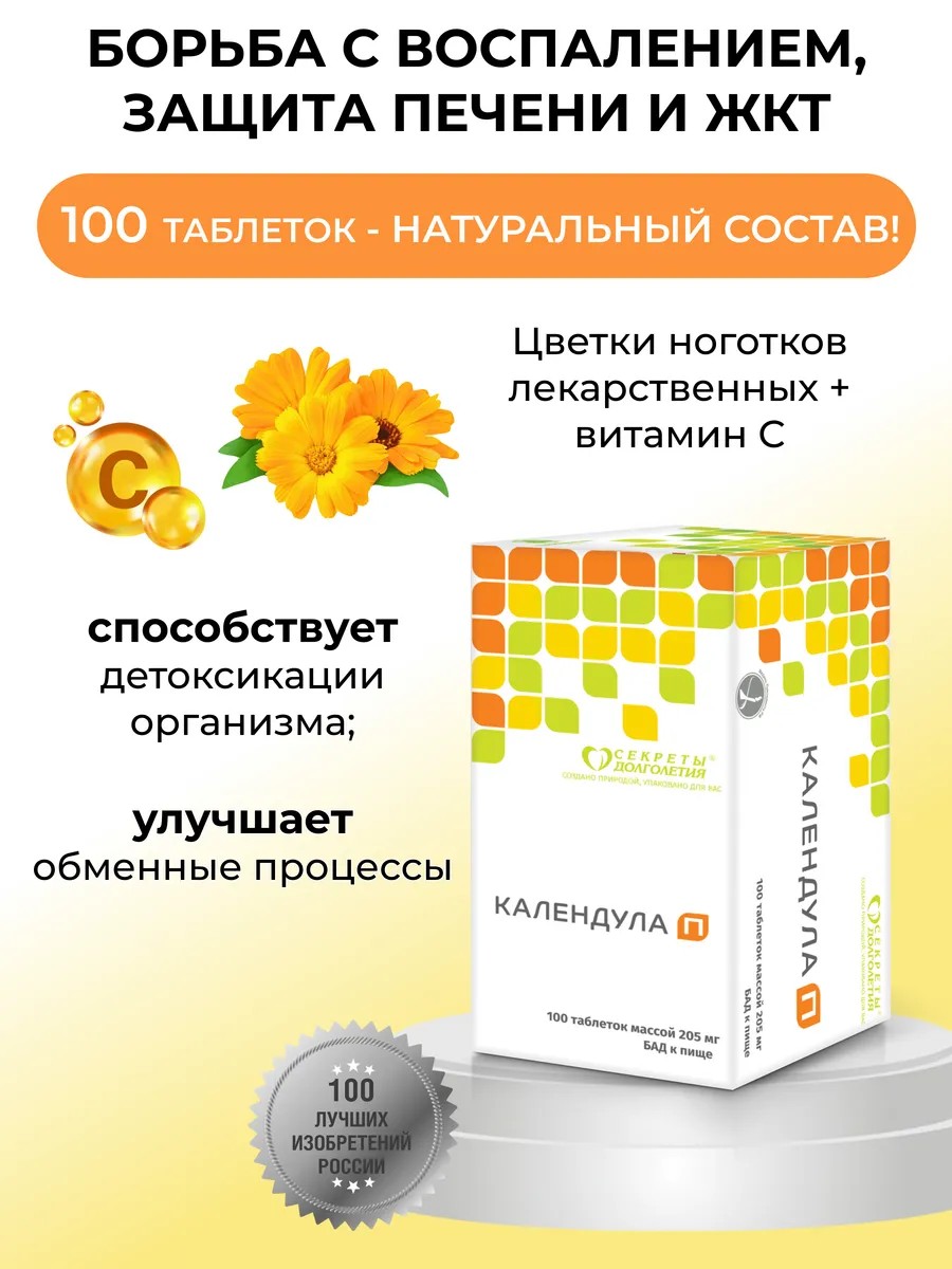 Календула П - это уникальный комплекс, содержащий витамин C, который способствуют укреплению иммунитета и защите органов, в том числе печени. Таблетки также содержат экстракт календулы, который известен своими антиоксидантными свойствами и способностью улучшать работу желудочно-кишечного тракта.