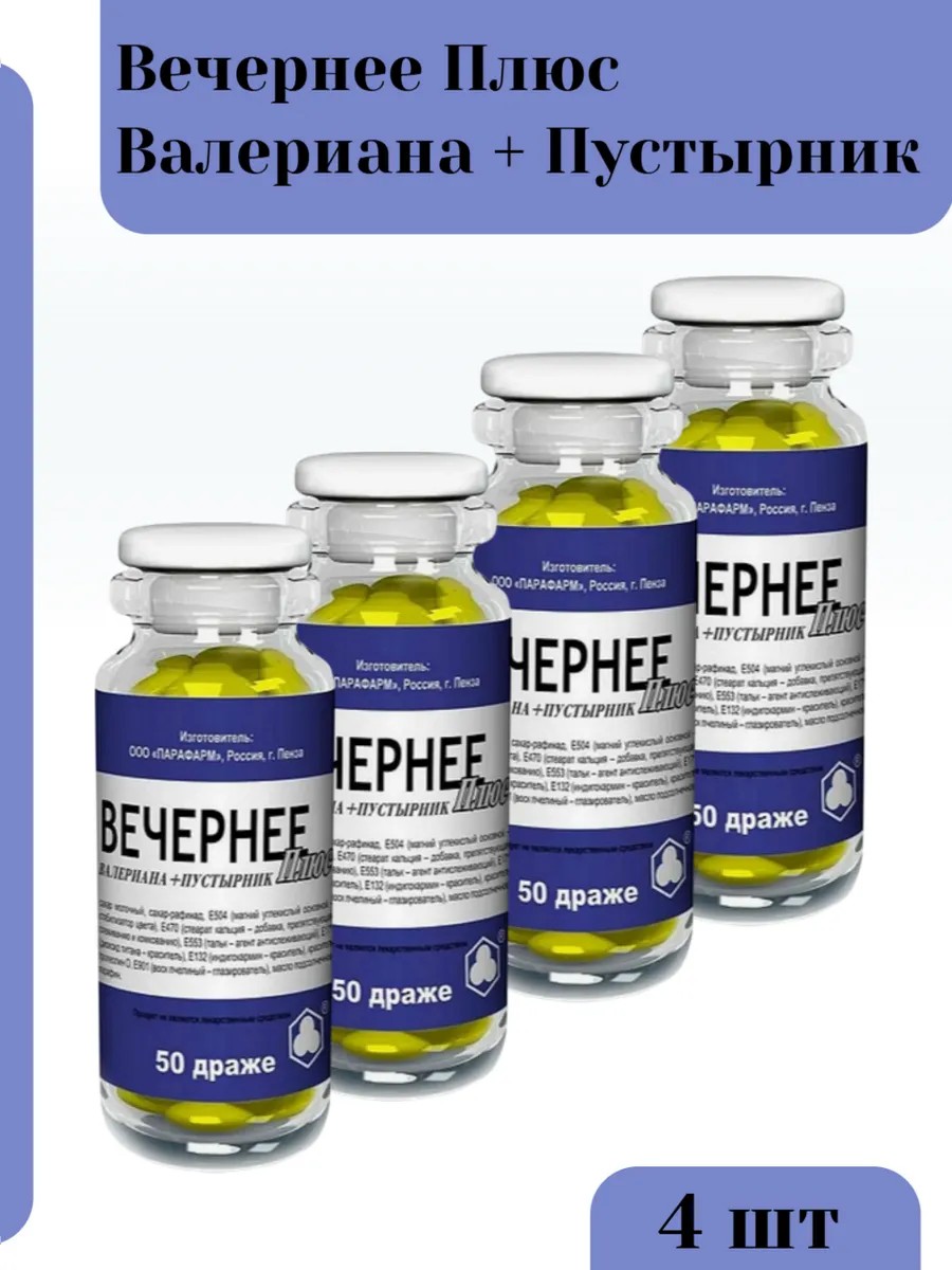 Драже "Вечернее Плюс", валериана + пустырник, седативное, транквилизирующее. Благодаря природному комплексу веществ драже вечернее обладает седативным, транквилизирующим, регулирующим сердечную деятельность и умеренными гипотензивными свойствами, является мягким спазмолитическим средством.Валериана оказывает многостороннее действие на организм. Она действует успокаивающе на возбужденную нервную систему. Валериана регулирует деятельность сердца, действуя через центральную нервную систему на приступы сердцебиения. Валериана улучшает секреторную функцию желудочно-кишечного тракта, снимает спазмы пищевода, помогает регулировать секрецию и выведение желчи.Терапевтическое действие валерианы обусловлено комплексом содержащихся в ней веществ, и, прежде всего, эфирным маслом и алкалоидами. В корневищах и корнях количество эфирного масла достигает 2 %.Препараты валерианы применяют в качестве успокаивающего средства при бессоннице, нервном возбуждении, неврозах сердечно-сосудистой системы, тахикардии, а также при эпилепсии, астме, мигрени, спазмах.