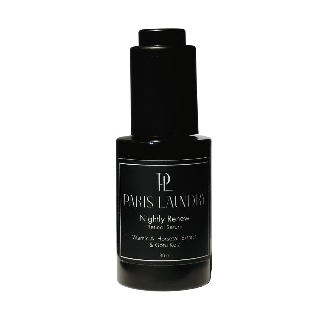 Transform your evening skincare ritual with Nightly Renew Retinol by Paris Laundry—a gentle yet effective night serum formulated with encapsulated retinol, botanical extracts, and skin-replenishing nutrients. Designed to work while you sleep, this serum supports cell turnover, improves skin texture, and promotes a radiant-looking complexion. Encapsulated retinol, a stabilized form of vitamin A, is slowly released to minimize irritation while helping to smooth and refine the skin's surface. Horsetail extract adds antioxidant support and helps purify the skin, while gotu kola is known to nourish and maintain elasticity. A blend of green tea, dandelion root, and jojoba oil helps calm, hydrate, and protect the skin overnight. Crafted for all skin types, including sensitive skin, this formula reflects our commitment to clean, science-backed skincare that delivers results without compromise. Wake up to skin that feels refreshed, balanced, and beautifully renewed.