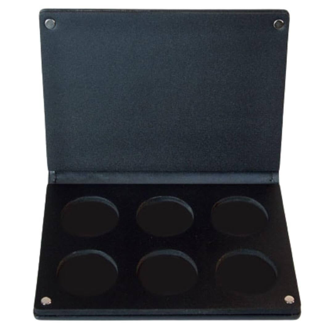 Mode d'emploi: Sélectionnez les teintes des fards souhaités en cliquant dans chaque emplacement vide afin de voir le nuancier. Palette de 6 fards à paupières façon cuir noir à personnaliser selon vos goûts. Palette vide 6 emplacements.