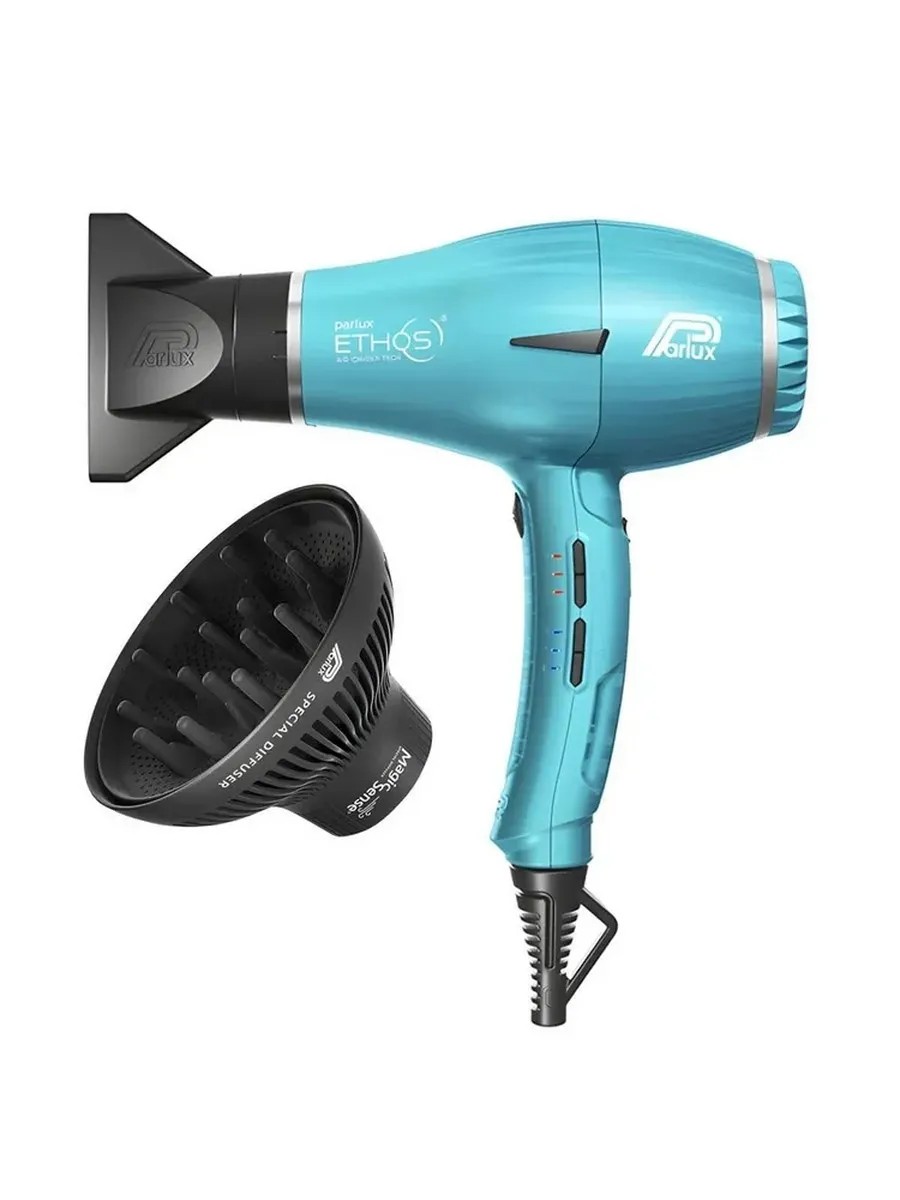 Parlux Ethos Hair Dryer Professional Hair Dryer Parlux Ethos 2300 W Azure digital perfection for a professional style without limits! The perfect combination of classic design and digital technology, Parlux ETHOS delivers exceptional performance and reliability that improve the daily work of professionals and enhance the user experience. Specifications: professional digital motor for better temperature and airflow control; Air Ionizer Tech Parlux ETHOS ionization system; power 2300 W; airflow rate - 88 m3 h 3 airflow speeds 3 temperature modes STC system 360-degree rotating cord cord length 3.3 m Brand country - Italy Buy a hair dryer with a diffuser Package includes: hair dryer 2 nozzles (Standard and Slim) Warranty card Magic Sense diffuser