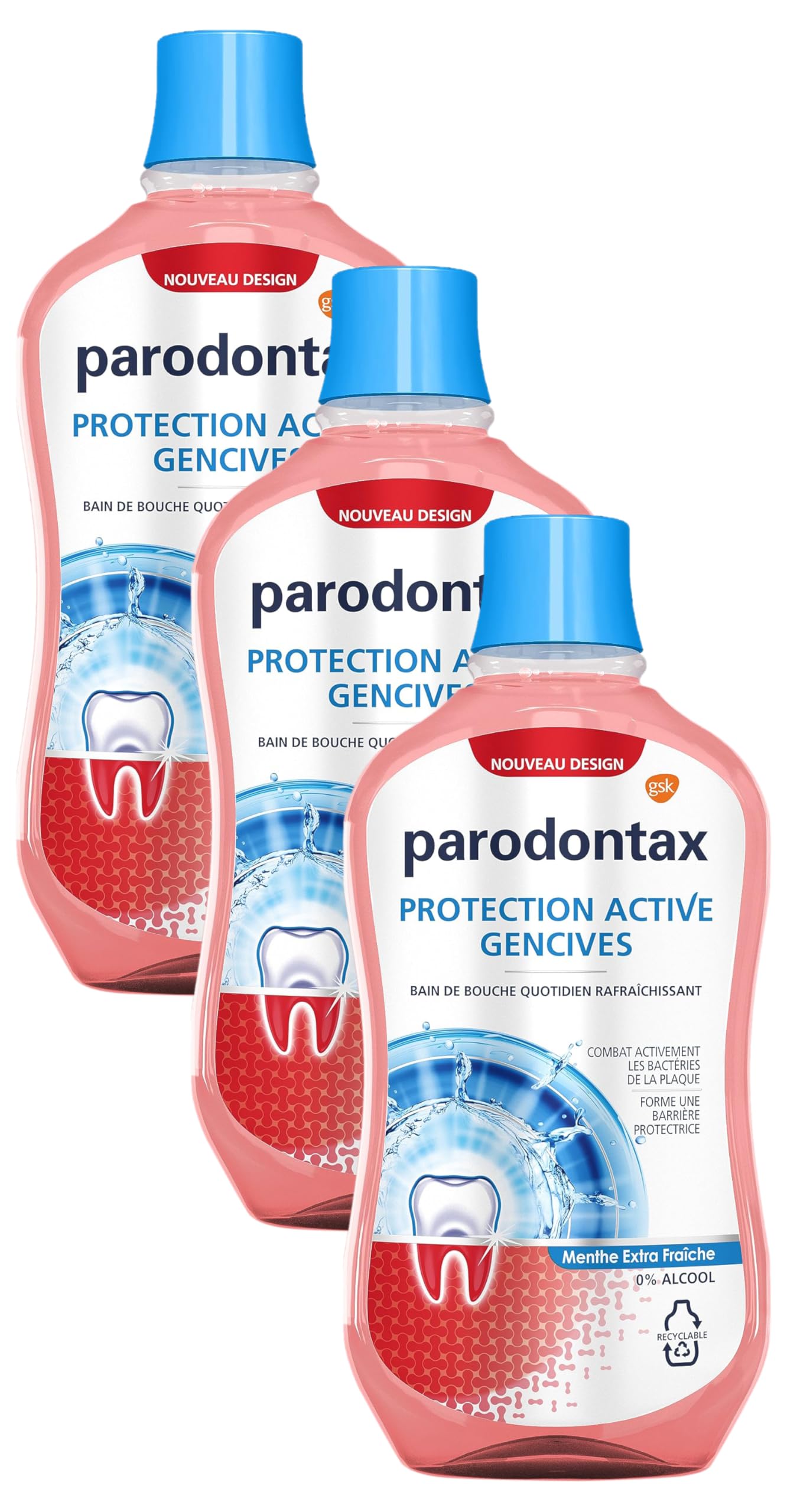 Description du produit Changez votre routine de soins bucco-dentaires avec le bain de bouche quotidien parodontax protection active gencives Menthe Extra Fraiche, un bain de bouche conçu par des experts de la santé des gencives. Il cible activement 3 x plus de bactéries de la plaque dentaire et crée un bouclier protecteur pour empêcher l'accumulation et l'installation de la plaque.L'accumulation de plaque dans les endroits difficiles d'accès est l'une des causes profondes des problèmes de gencives. C'est pourquoi le bain de bouche quotidien parodontax protection active gencives cible 3x plus de bactéries de la plaque dentaire - grâce à ses ingrédients antibactériens, l'o-cymen-5-ol et le zinc, qui agissent en synergie.Le bain de bouche quotidien parodontax protection active gencives aide ainsi à prévenir l'accumulation des bactéries de la plaque dentaire. Il est scientifiquement prouvé qu'il aide à maintenir les gencives et les dents en bonne santé. Utilisez-le dans le cadre de votre routine quotidienne de soins bucco-dentaires pour aider à maintenir une gencive saine.Le bain de bouche quotidien parodontax protection active gencives prend soin de l'ensemble de la bouche. Il cible les bactéries de la plaque dentaire que le brossage laisse derrière lui. Il est aromatisé à la menthe fraîche et doté d'une technologie qui laisse une sensation de fraîcheur. Le bain de bouche contient 0 d'alcool et est présenté dans un flacon et un bouchon recyclables .Essayez le bain de bouche quotidien parodontax protection active gencives, qui contribue à améliorer la santé des gencives.IngrédientsInformations dans l'emballage Ingrédients Informations dans l'emballage Mode d'emploi Rincez-vous la bouche pendant 30 secondes avec 10 ml de solution, 1 à 2 fois par jour après le brossage. Ne pas rincer. Avertissement De Sûreté Ne pas avaler. Tenir hors de portée des enfants. Voir plus