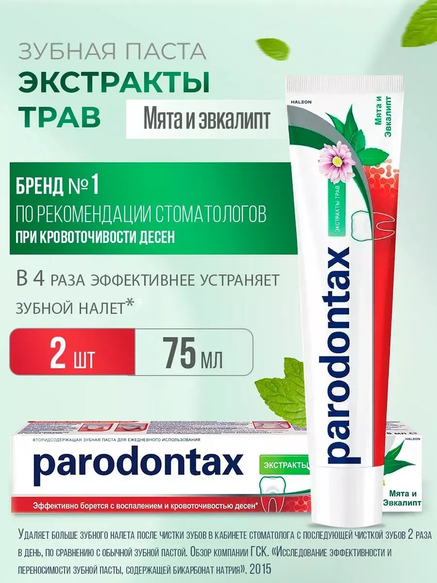 Parodntax toothpaste set for gum inflammation and bleeding with medicinal herbs, 75 ml. Parodontax "Herbal Extracts" toothpaste contains natural ingredients that strengthen tooth enamel and protect it from cavities. Eucalyptus extract has analgesic properties and has a beneficial effect on emotional well-being. This medicated toothpaste with mint and herbal flavors contains ginger extract to heal gums and is also excellent for severe sensitivity caused by hot or cold drinks. It is recommended to use the travel toothpaste for oral care and hygiene, as well as to improve the healing and regeneration of tooth enamel after damage or gums after bleeding. This toothpaste is suitable for adults and children 14 years and older. This natural toothpaste for teenagers will not only strengthen teeth but also leave them with long-lasting fresh breath. This oral care product effectively combats conditions such as periodontal disease and tartar buildup. Organic cosmetics strengthen tooth enamel, reduce tooth sensitivity, and reduce bleeding gums. Its special formula has remineralizing, hemostatic, and anti-inflammatory properties. Regular use has been clinically proven to improve the condition of teeth and gums. This toothpaste for braces is suitable for daily use twice a day.