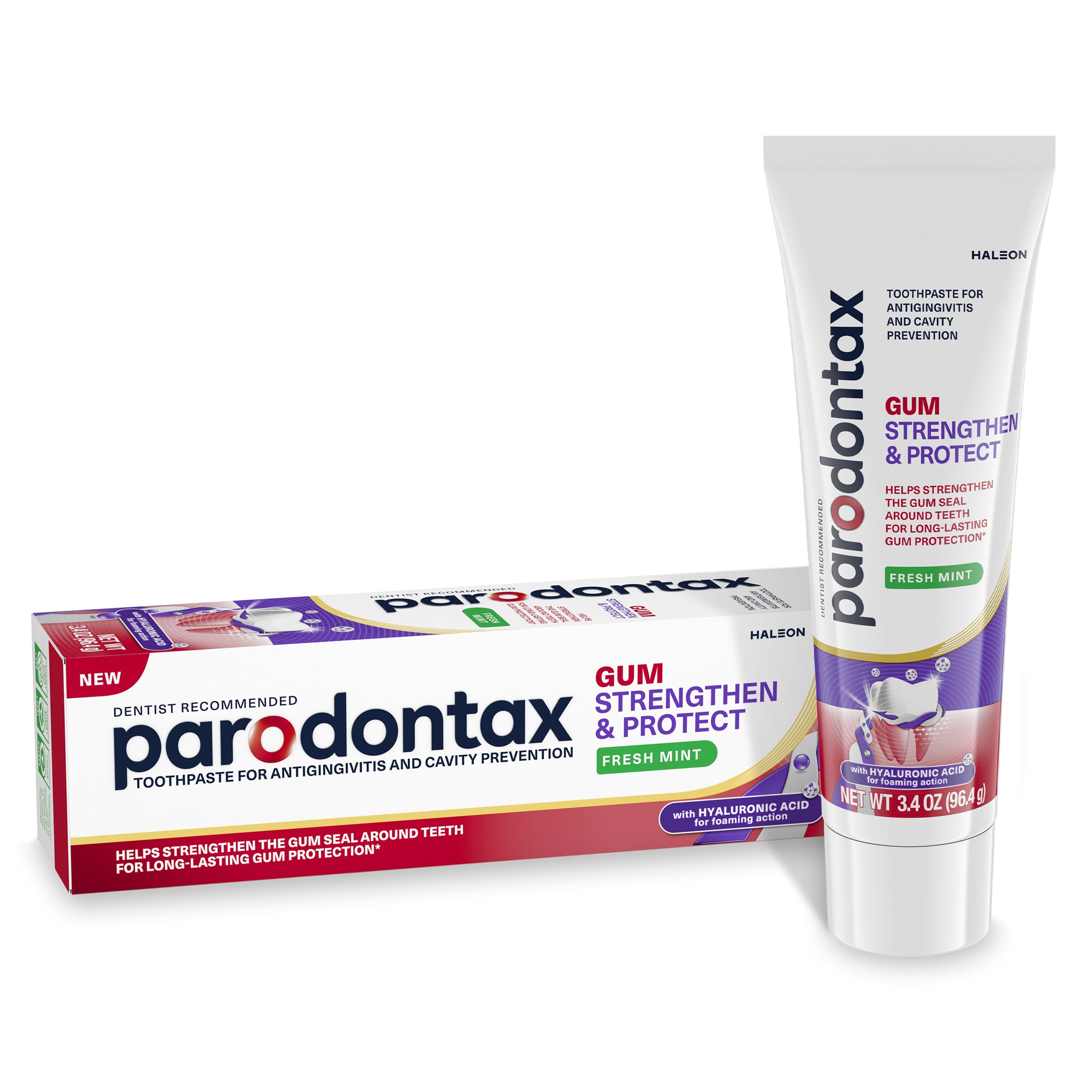 WITH HYALURONIC ACID: Contains hyaluronic acid for foaming action. CLINICALLY PROVEN INGREDIENT: To protect against gum problems (1). This antigingivitis toothpaste with stannous fluoride protects against cavities and improves gum health (1). LONG-LASTING GUM PROTECTION: Strengthens the gum seal around teeth for long-lasting gum protection (1). PROTECTS: parodontax toothpaste protects by preventing plaque bacteria build-up to maintain healthy gums every day (1). STRENGTHENS: parodontax Gum Strengthen and Protect kills plaque bacteria along the gumline for a stronger and tighter seal between gums and teeth. INCLUDES: One 3.4 oz tube of parodontax Gum Strengthen and Protect Fresh Mint Toothpaste.