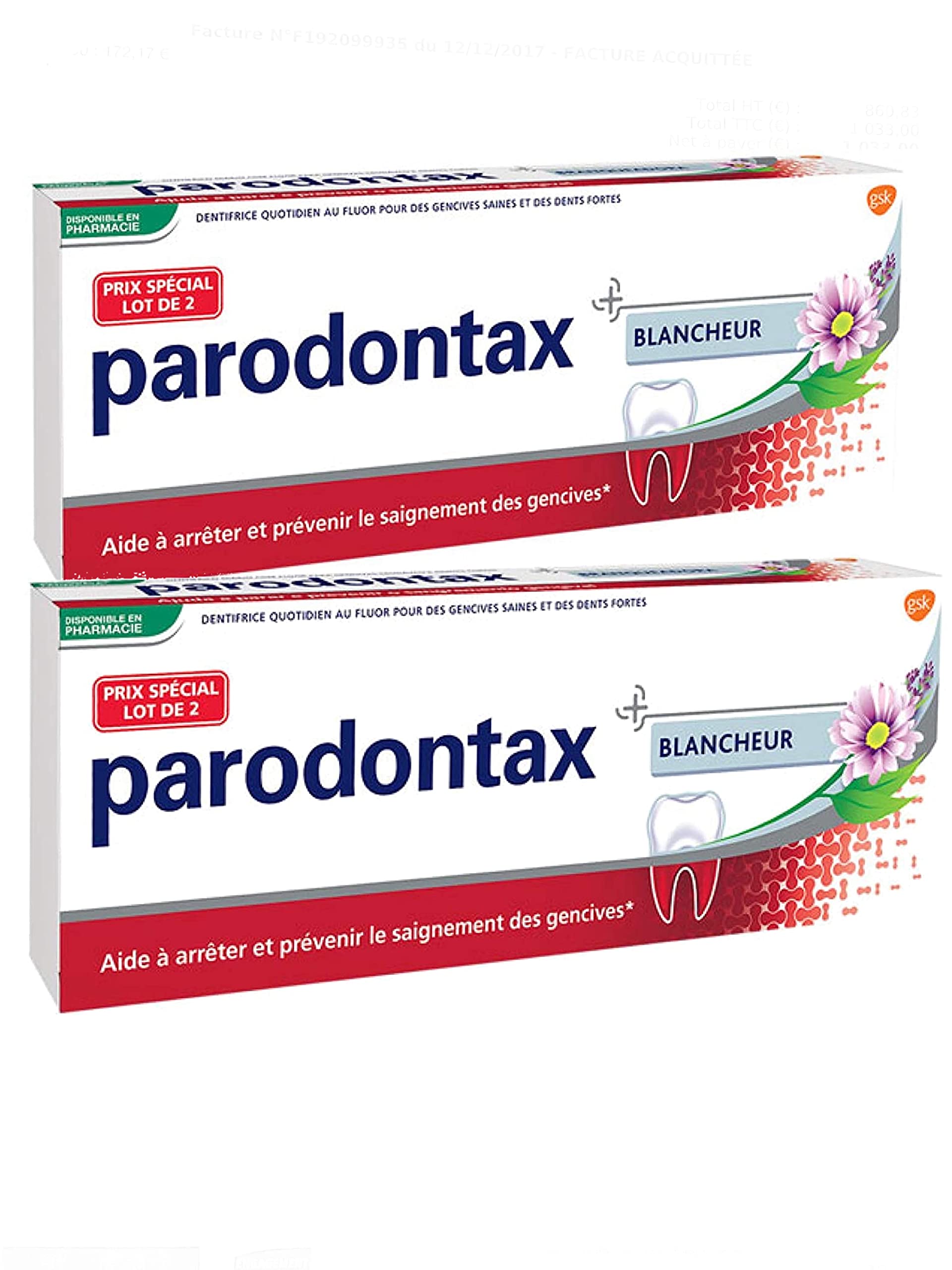 Parodontax Fluoride Whitening Toothpaste 2 x 75ml is formulated to help effectively reduce plaque. Bleeding gums can be caused by plaque buildup. The sodium bicarbonate formula, used in conjunction with daily brushing, cleans teeth by promoting plaque reduction, thus helping to reduce occasional bleeding. Its fluoride formula helps prevent cavities. When used regularly, this toothpaste helps restore the natural whiteness of teeth by removing surface stains. Unique flavor formula: Mint, Myrrh, Chamomile, Echinacea, Mineral Salts, Ratanhia, Sage. SAFETY WARNING For external use only. Keep out of reach of children. If irritation occurs, discontinue use and consult a dentist.Used regularly, this toothpaste helps restore the natural whiteness of teeth by removing surface stains. 4 tubes of 75ml. Parodontax toothpaste strengthens and cares for teeth and gums. Parodontax toothpastes contain 6 plant extracts and mineral salts, a unique combination of ingredients that gives the product its distinctive taste. After 14 days of use, most people who tested it appreciated its unique taste. A toothpaste specially formulated to help maintain healthy gums.Parodontax Dentifrice Fluor BLANCHEUR - Pate Gingivale pour Gencives - 2 Lots de 2 x 75 ml (B4)DESCRIPTION DU PRODUIT DESCRIPTION DU PRODUIT Parodontax Dentifrice Blancheur au Fluor Lot de 2 x 75 ml est formulé pour aider à réduire efficacement la plaque bactérienne. Le saignement des gencives peut être causé par la formation de la plaque bactérienne. La formule à base de bicarbonate de sodium, en complément d'un brossage quotidien, nettoie les dents en favorisant la réduction de la plaque, aidant donc à réduire les saignements occasionnels. Sa formule à base de fluor permet de prévenir l'apparition de caries. Utilisé régulièrement, le dentifrice aide à restaurer la blancheur naturelle des dents en enlevant les taches superficielles. Formule au goût unique : Menthe, Myrrhe, Camomille, Echinacée, Sels minéraux, Ratanhia, Sauge. AVERTISSEMENT DE SÉCURITÉ Reservé à l'utilisation externe. Conserver hors de portée des enfants. En cas d'irritation, cesser l'utilisation et consulter un dentiste.Utilisé régulièrement, le dentifrice aide à restaurer la blancheur naturelle des dents en enlevant les taches superficielles. 4 Tubes de 75ml. Le dentifrice parodontax renforce les dents et gencive, et en prend soin. Les dentifrices parodontax contiennent 6 extraits de plantes et des sels minéraux, une combinaison unique d'ingrédients qui confère au produit un goût particulier. Après 14 jours d'utilisation, la plupart des personnes qui l'ont testé, ont apprécié son goût unique. Un dentifrice spécialement formulé pour aider à maintenir les gencives en bonne santé.