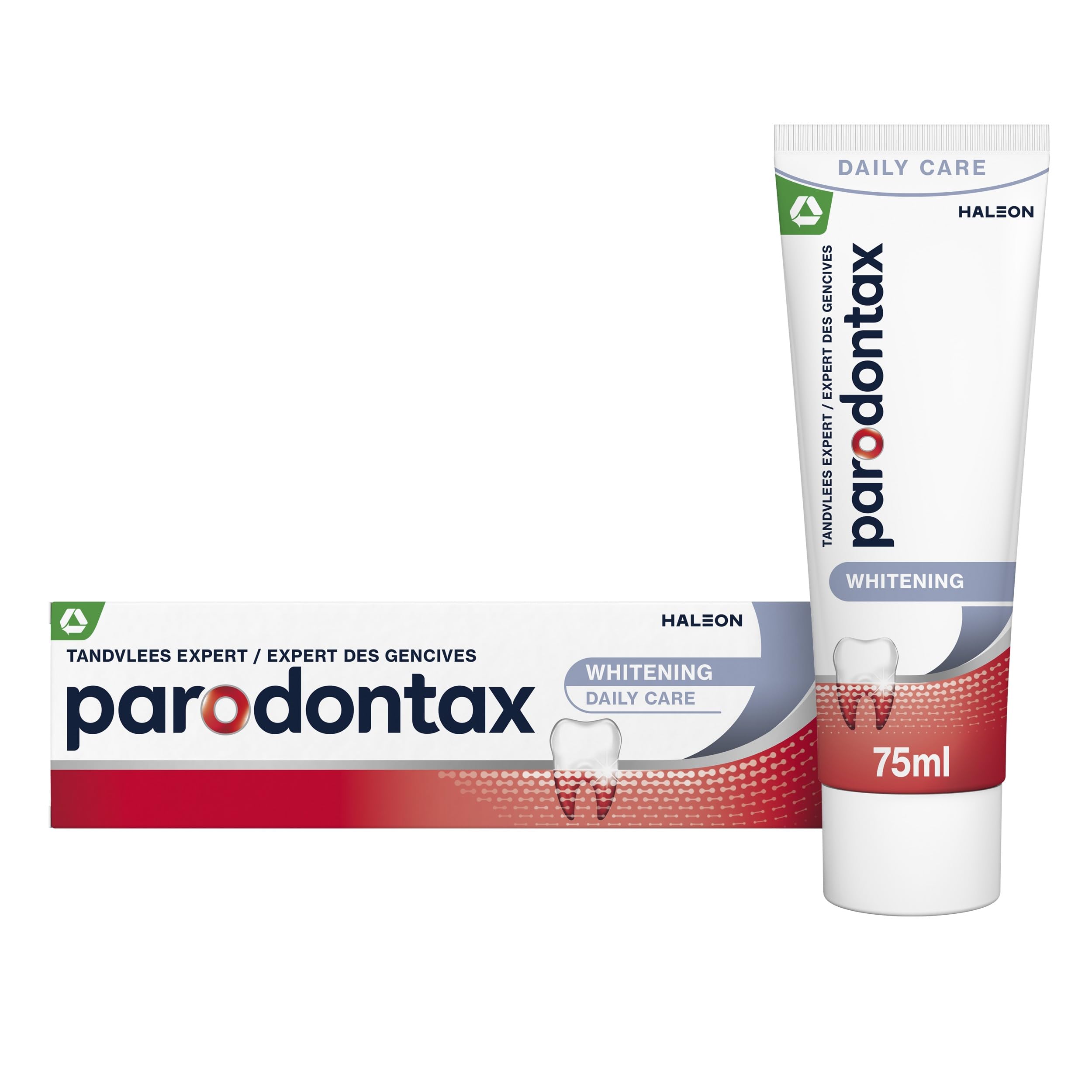 DESCRIPTION DU PRODUIT DESCRIPTION DU PRODUIT Parodontax werkt doordat het de opbouw van tandplak tegengaat. Parodontax Whitening biedt dagelijkse reiniging en helpt de natuurlijke witheid van tanden te behouden door het voorzichtig verwijderen van oppervlakkige vlekken. Nu met verbeterde smaak. Het is klinisch bewezen dat dagelijks poetsen met Parodontax helpt tegen bloedend tandvlees en tandvlees problemen voorkomt. Om bloedend tandvlees te helpen stoppen en voorkomen, gebruik trouw 2x daags. INGRÉDIENTS Sodium Bicarbonate, Aqua, Glycerin, Hydrated Silica, Cocamidopropyl Betaine, Aroma, Xanthan Gum, Sodium Fluoride, Sodium Saccharin Steviol Glycosides, Limonene, CI 77491. Bevat natriumfluoride