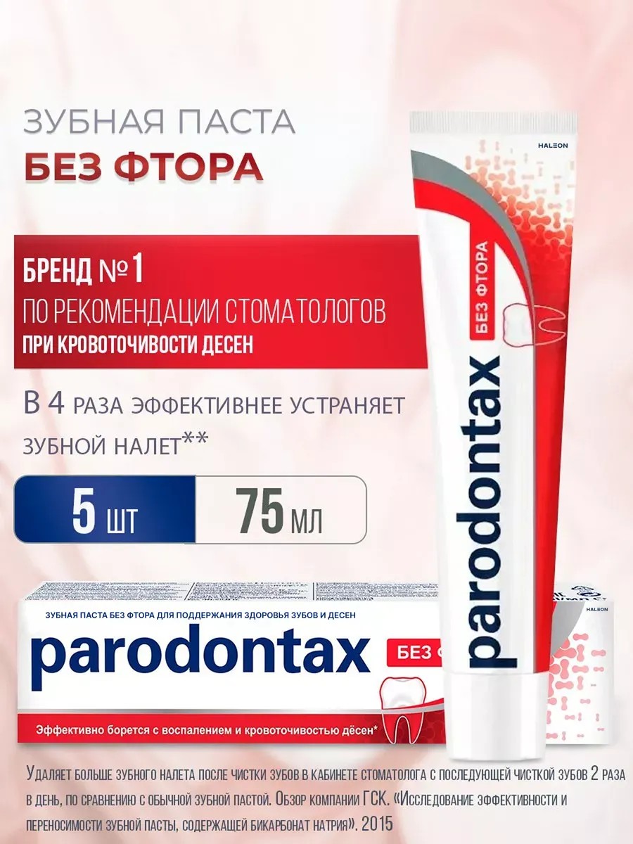Parodontax без фтора разработан смотатологами для чувствительных и воспаленных зубов. Косметика для полости рта это натуральная защита эмали и зубов от кариеса. Объём пасты 75 мл. Пародонтакс разработали специальную формулу, которая предназначена для безопасного и деликатного ухода и гигиене полости рта. Зубная паста набор 5 шт включает в состав уникальные полирующие частицы, которые заметно осветляют эмаль и делают поверхность зубов идеально гладкой. Зубная паста парадонтакс для брекетов содержит натуральные антибактериальные компоненты которые препятствуют распространению бактерий, действенно борются с образованием зубного налета и неприятным запахом изо рта. Гигиена полости рта одна из важнейших вещей в жизна каждого подростка, взрослого или ребенка. Зубная паста со вкусом мяты позволит сохранить ваши зубы здоровыми, а дыхание свежим на долгое время. Начните пользоваться профессиональной натуральной пастой и наслаждайтесь результатом! Набор зубных паст для чувствительных зубов не имеет в своем составе фтора. Если ваши зубы чувствительны к холодному и горячему,кислому или сладкому то выбор очевиден это паста Пародонтакс! Оргинеческая косметика содержит только самые лучшие компоненты, которые действенно укрепляют зубную эмаль, тем самым устраняя причину повышенной чувствительности зубов. Дорожная зубная паста обладает реминерализирующим, кровоостанавливающим и противовоспалительным эффектом. Клинически доказано, что зубная паста при регулярном использовании улучшает состояние зубов и десен. Зубная паста текстурная для комплексного ухода нежно заботиться об эмали благодаря натуральному составу. Рекомендуется к применению взрослым, детям с 14 лет. Паста прекрасно очистит зубы от остатков пищи, тем самым предотвращая появление камня и кариеса.
