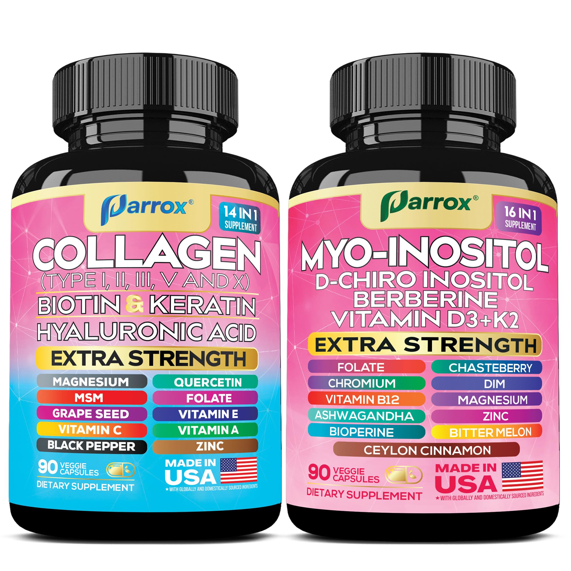 The Blooming Balance Bundle by Parrox unites two powerful formulas to nourish your glow and ground your wellness. Featuring a 14-in-1 Collagen Beauty Blend and a 16-in-1 Myo Inositol Hormonal Support Complex, this 30-in-1 daily stack supports skin, hair, and nail vitality while promoting mood, metabolism, and hormone balance. Thoughtfully crafted with high-impact ingredients like Hydrolyzed Collagen Peptides, Biotin, Keratin, D-Chiro Inositol, DIM, and Ashwagandha, it delivers broad-spectrum support in clean, easy-to-take capsules. Ideal for modern women seeking simplicity without compromise, the Blooming Balance Bundle is your all-in-one solution for radiance and resilience. Clean, tested, and trusted—made to help you feel as vibrant as you look.Made with Care, Backed by Testing – Each formula is crafted in the USA in a certified facility and third-party tested for quality. You get clean, reliable ingredients in a form that fits into your daily routine with confidence. Clean, Simple Ingredients You Can Trust – Parrox supplements are made without artificial additives, fillers, or preservatives. Every capsule is designed for purity, easy absorption, and everyday use. Designed for the Modern Lifestyle - Whether you're managing a demanding schedule or optimizing your supplement stack, this bundle delivers daily support without powders, sugars, or complexity. With 180 high-absorption capsules and clinically-researched ingredients, Parrox helps you stay consistent, energized, and glowing—no matter your pace. Synergistic Formulas for Daily Wellness - This dual-stack combines nutrient-dense ingredients like MSM, Zinc, Magnesium, and Vitamin C with powerful adaptogens including Ashwagandha and Chasteberry. These ingredients work in synergy to support stress management, metabolic health, and enhanced vitality—simplifying your wellness routine into two targeted, easy-to-take formulas. Total Body Radiance Inner Balance - Glow from the inside out with this comprehensive 30-in-1 bundle. The collagen complex delivers skin, hair, and nail support with hydrolyzed peptides, biotin, keratin, and hyaluronic acid, while the inositol formula supports hormonal harmony, mood stability, and energy—offering a full-spectrum approach to beauty and balance.