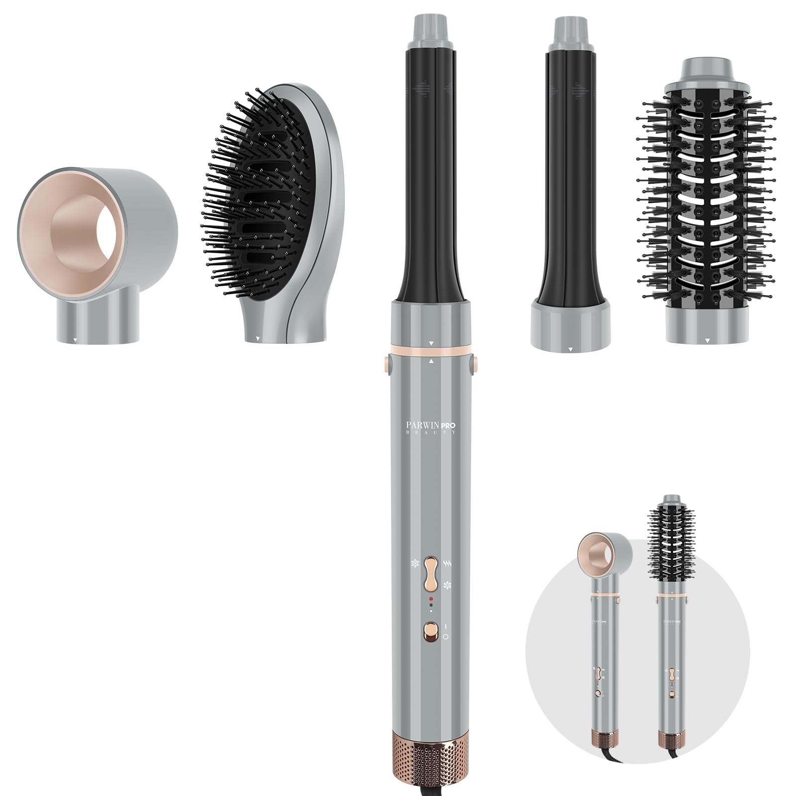 MaxAir Styler, 5-in-1, for drying, smoothing, volume and curls SAFETY WARNING Keep out of the reach of children, do not rinse or immerse in water, keep the plug and cord away from heated surfaces, do not use a hair dryer when bathing.IONIC CARE – the MaxAir Styler has a built-in generator that releases negative ions from the hairdryer round brush paddle brush and actively counteracts static electricity and adds shine through an anti-frizz effect. Increases smoothness, reduces centrifugal force and provides more volume. The airflow with negative ions works on the hair, giving it volume and making it look shinier and smoother. 5-in-1 Styling Set: The MaxAIR Styler is a multifunctional hair brush set that perfectly meets your versatile styling needs. It can be used as a hairdryer, curling iron, hairdryer brush, round brush, hairdryer brush and straightening brush. Multiple functions are combined in an excellent, practical styling set, so you can achieve various beautiful hairstyles efficiently and time-saving. Intelligent Heat Control - The intelligent heat control measures the heat of the airflow up to 100 times per second and ensures an even temperature and air distribution for even drying, so you don't have to worry about extreme heat damage. Curling iron with automatic absorbent attachment: a powerful airflow flows from the curling iron and forms a continuous airflow around the curling iron, which enhances the coanda effect and ensures that the hair automatically adheres to the surface. Creates voluminous, smooth and natural curls without extreme heating. High-speed airflow: The self-developed high-speed motor with up to 110,000 rpm produces a fast and powerful airflow at a speed of up to 17 m s, 6 times stronger than a conventional hairdryer hot air brush. For ultra-fast drying without heat damage, it saves your styling time in half. Innovation for an extraordinary styling experience.MaxAIR Styler, 5-in-1 haardroger, warmluchtborstelset, Air Styler met 110.000 tpm hoge toerige motor, haarstyler voor drogen, gladmaken, volume, krullen, ionenverzorging (grijs) MaxAir Styler, 5-in-1, voor drogen, gladmaken, volume en krullen VEILIGHEIDSWAARSCHUWING Buiten het bereik van kinderen houden, niet afspoelen of onderdompelen in water, houd de stekker en het snoer uit de buurt van verwarmde oppervlakken, gebruik geen föhn tijdens het baden.IONIC CARE – de MaxAir Styler beschikt over een ingebouwde generator, die negatieve ionen uit de haardroger ronde borstel paddleborstel vrijgeeft en door een anti-frizz-effect actief statische elektriciteit tegengaat en glans geeft. Verhoogt de gladheid, vermindert de centrifugale kracht en zorgt voor meer volume. De luchtstroom met negatieve ionen werkt op het haar, geeft het volume en laat het er glanzender en gladder uitzien. 5-in-1 styling-set: de MaxAIR Styler is een multifunctionele haarborstelset die perfect aan je veelzijdige styling-eisen voldoet. Het kan als haardroger, krultang, haardrogerborstel, ronde borstel, föhnborstel en stijlborstel worden gebruikt. Meerdere functies zijn gecombineerd in een uitstekende, praktische styling-set, zodat je efficiënt en tijdbesparend verschillende mooie kapsels kunt bereiken. Intelligente warmteregeling – de intelligente warmteregeling meet de warmte van de luchtstroom tot 100 keer per seconde en zorgt voor een gelijkmatige temperatuur en luchtverdeling voor gelijkmatig drogen, zodat je niet bang hoeft te zijn voor extreme hitteschade. Krultang met automatische absorberende opzetstuk: een krachtige luchtstroom stroomt uit het krultang en vormt een continue luchtstroom rond de krultang, die het coanda-effect versterkt en ervoor zorgt dat het haar automatisch aan het oppervlak hecht. Creëert volumineuze, gladde en natuurlijke krullen zonder extreme verwarming. Hoge snelheid luchtstroom: de zelf ontwikkelde hogesnelheidsmotor met maximaal 110.000 omw min produceert een snelle en krachtige luchtstroom met een snelheid van maximaal 17 m s, 6 keer sterker dan een conventionele heteluchtborstel van een haardroger. Voor ultrasnel drogen zonder hitteschade, bespaart het je stylingtijd met de helft. Innovatie voor een buitengewone styling-ervaring.