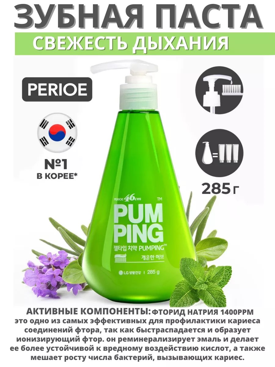 Perioe Breath Care Pumping — это освежающая зубная паста с насыщенным вкусом мяты и трав, которая активно борется с неприятным запахом и заботится о длительной свежести дыхания. Специальная формула предотвращает образование невидимой плёнки на поверхности зубов, которая является одной из причин неприятного запаха изо рта. Зубная паста имеет гелевую консистенцию, быстро растворяется и хорошо пенится. Пузырьки геля обволакивают каждый зуб, проникая в самые труднодоступные места, тем самым уменьшая риск появления кариеса. Активные компоненты в составе Perioe Breath Care обеспечивают чистоту и здоровье полости рта. Пирофосфат калия эффективно очищает зубы от налёта и предотвращает его образование в течение всего дня. Витамин Е — антиоксидант, который укрепляет дёсны. Фторид натрия обеспечивает профилактику и защиту от кариеса, а также укрепление эмали. Флакон с дозатором вмещает в себя 3 обычных тюбика зубной пасты, такая упаковка помогает экономичнее расходовать продукт.