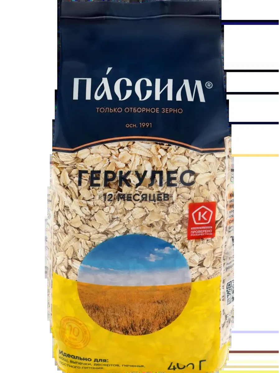 PASSIM Hercules 12-Month Oatmeal Flakes are a classic healthy food product made using traditional technology from select oat grains. A unique feature of these flakes is their extended shelf life (12 months) without losing their nutritional value, achieved through special grain processing. During production, the oats are carefully steamed and flattened, preserving maximum nutrients: slow carbohydrates for long-lasting satiety, plant proteins (13% of the composition), valuable fatty acids, and a rich vitamin and mineral complex. PASSIM oatmeal flakes contain a unique combination of B vitamins (B1, B2, B4), responsible for energy metabolism, vitamin K for healthy blood, as well as important micronutrients – potassium for the heart, phosphorus for the brain, iron for hematopoiesis, magnesium for the nervous system, and iodine for the thyroid gland. Thanks to its high dietary fiber content (10%), the product promotes gentle cleansing of the body and maintains healthy intestinal microflora. Hercules flakes cook in just 10-15 minutes, preserving their pleasant texture and natural nutty flavor. They are ideal for nutritious breakfasts and serve as a base for porridge, muesli, and homemade baked goods. Nutritionists recommend the product as part of a balanced diet for children (from 1.5 years old), athletes, and anyone who cares about their health. PASSIM guarantees the naturalness of its ingredients—no artificial additives, GMOs, or preservatives. Start your day with the energy of real Hercules—healthy, time-tested oatmeal!