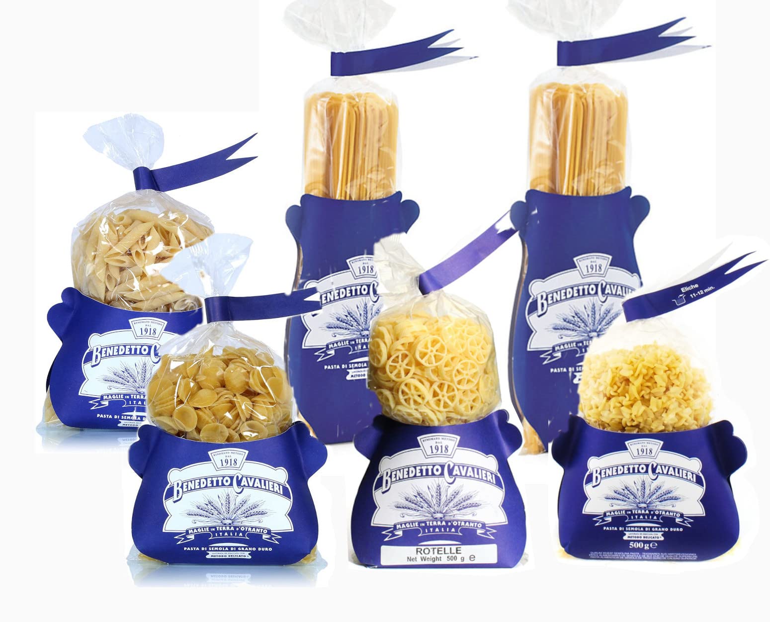 PASTA CAVALIERI LU Vientu Pasta Tasting Box - Cavaliers Spaghetti - Roulettes - Medium Striped - liques - Noodles - Smooth Pens - Durum Grain Semolina Pasta - Artisan product made in Salento (6 x 500 g)