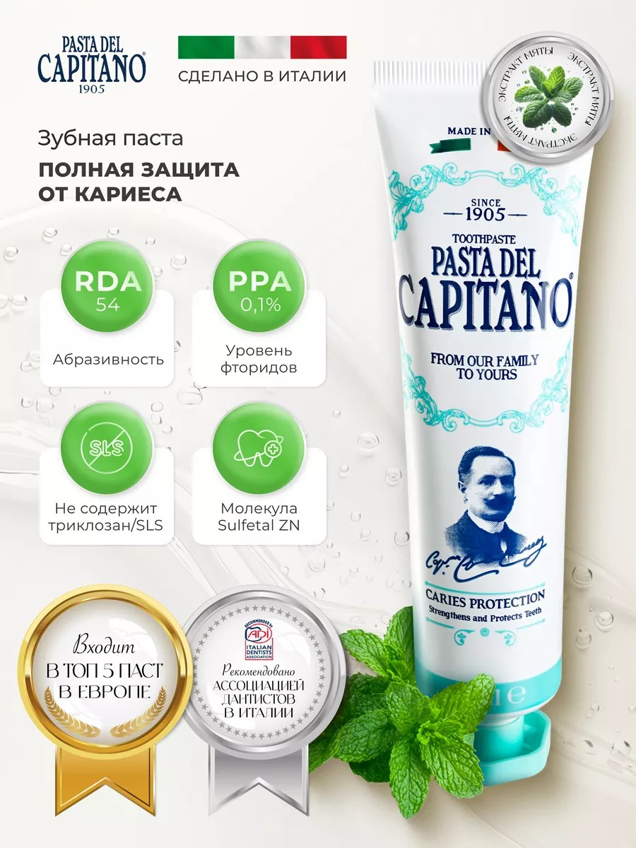 Откройте для себя непревзойденное качество и эффективность зубной пасты Pasta del Capitano 1905 Полная защита от кариеса объемом 75 мл. Специально разработанная формула обеспечивает надежную защиту от кариеса, ежедневно заботясь о здоровье и чистоте ваших зубов. Сочетая в себе традиции и новейшие научные разработки, эта паста дарит вам уверенность в каждой улыбке. В основе рецептуры лежат многолетние итальянские традиции ухода за полостью рта, которые обеспечивают превосходные результаты. Благодаря своим уникальным компонентам, Pasta del Capitano минимизирует риск кариеса и оказывает пролонгированное действие, что делает ее незаменимым элементом вашей ежедневной гигиены.Эта особенная зубная паста не только эффективно очищает зубы, удаляя налет и предотвращая образование зубного камня, но и заботится о деснах, предотвращая их воспаление. В состав продукта входят инновационные компоненты, обеспечивающие полное восстановление эмали, что особенно важно для тех, кто ищет эффективное средство после использования biorepair зубной пасты. Несмотря на свою эффективность, паста обладает мягким, приятным вкусом и нежной текстурой, что делает чистку зубов настоящим удовольствием.Итальянское качество – это то, что отличает зубную пасту Pasta del Capitano от прочих аналогов. Продукт сочетает в себе экологички чистые и безопасные ингредиенты, что подходит для использования всей семьей. В отличие от множества других зубных паст, этот продукт не содержит агрессивных химических элементов, способных повредить эмаль или вызвать дискомфорт во время чистки. Независимо от того, используете ли вы пасту для ежедневной профилактики или для решения уже существующих проблем, вы можете быть уверены в ее надежности и эффективности.Высокое качество ингредиентов и жесткие стандарты производства гарантируют, что вы получите наилучший уход для ваших зубов. Паста легко справляется с задачами, которые стоят перед любой современной зубной пастой: удаление налета, предотвращение кариеса и забота.