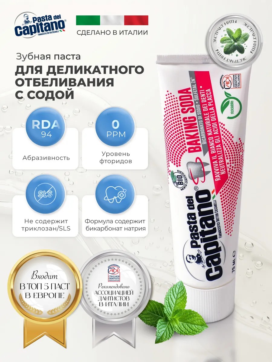 Зубная паста Pasta del Capitano для деликатного отбеливания с содой объемом 75 мл представляет собой идеальное решение для тех, кто стремится к белоснежной улыбке, не повреждая при этом зубную эмаль. Среди широкого ассортимента средств для ухода за полостью рта, эта паста выделяется своей уникальной формулой, сочетающей в себе деликатность и эффективность. Зубная паста из Италии известна своими качественными ингредиентами и строгими стандартами производства, и Pasta del Capitano не является исключением. Активным компонентом пасты является сода, которая мягко очищает и полирует зубы, устраняя поверхностные пятна и предотвращая их повторное появление. В отличие от многих отбеливающих зубных паст, Pasta del Capitano обеспечивает нежный уход за эмалью, что делает ее подходящей для регулярного использования. Эта паста также содержит компоненты, которые способствуют укреплению зубной эмали, борются с зубным налетом и обеспечивают свежее дыхание на протяжении всего дня. Pasta del Capitano – это не просто средство для чистки зубов, а целый комплекс для ухода за полостью рта, который дарит уверенность в своем дыхании и улыбке. Если вы уже знакомы с такими продуктами, как бирепэер зубная паста, то вам непременно стоит попробовать Pasta del Capitano для деликатного отбеливания с содой – результат вас не разочарует.