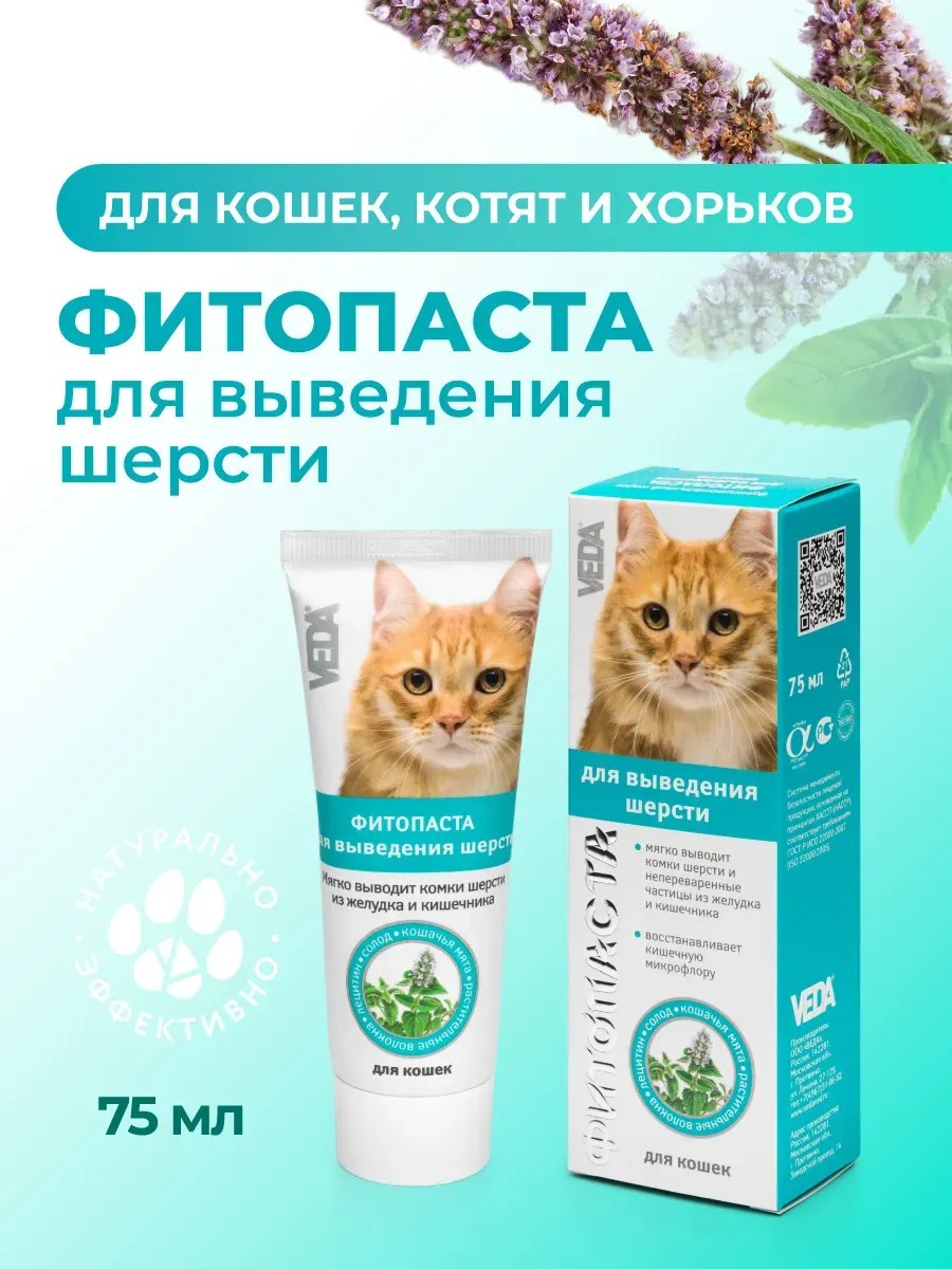 Paste for removing hair PHYTOPASTE is an effective remedy for removing hair for cats, kittens, and ferrets. It helps remove balls of swallowed (licked) cat hair, undigested food particles, and fragments of eaten toys from the gastrointestinal tract of pets. • Daily use of the paste during shedding will prevent the formation and accumulation of hairballs in the digestive system. • The phytocomponents of the paste (malt paste) enhance each other's effects and provide maximum effect in removing hair and other indigestible particles. • Contains components that help restore and protect the liver and intestinal microflora (lecithin). Properties of the substances and natural plant components included in the product: • Malt extract and plant fibers separate and naturally remove hairballs and undigested eaten particles. Stimulate the growth of normal intestinal microflora. • Castor and vaseline oils envelop accumulated hair, prevent injury to the walls of the stomach and intestines (GIT) of the animal when removing a swallowed foreign body. • Catnip improves palatability, stimulates digestion, relieves spasms and colic. Application: once a day every day before feeding or add to food: - for cats weighing over 2 kg - 5 cm of paste; - for cats weighing up to 2 kg, kittens - 2 cm of paste; - for ferrets - 2 cm of paste. Economical: one tube, depending on the weight and breed of the cat, is enough for 20-45 days. Prophylactic use of malt paste is especially recommended during shedding and for cats of long-haired breeds, as well as with sensitive digestion and in case of difficulty regurgitating licked hair. Suitable for castrated cats and sterilized cats. A line of pet products from the Russian manufacturer VEDA – developed by professionals for your veterinary pharmacy with love and daily care for the beauty and health of pets. Malt paste, malt paste, malt paste, malt paste, phyto paste.