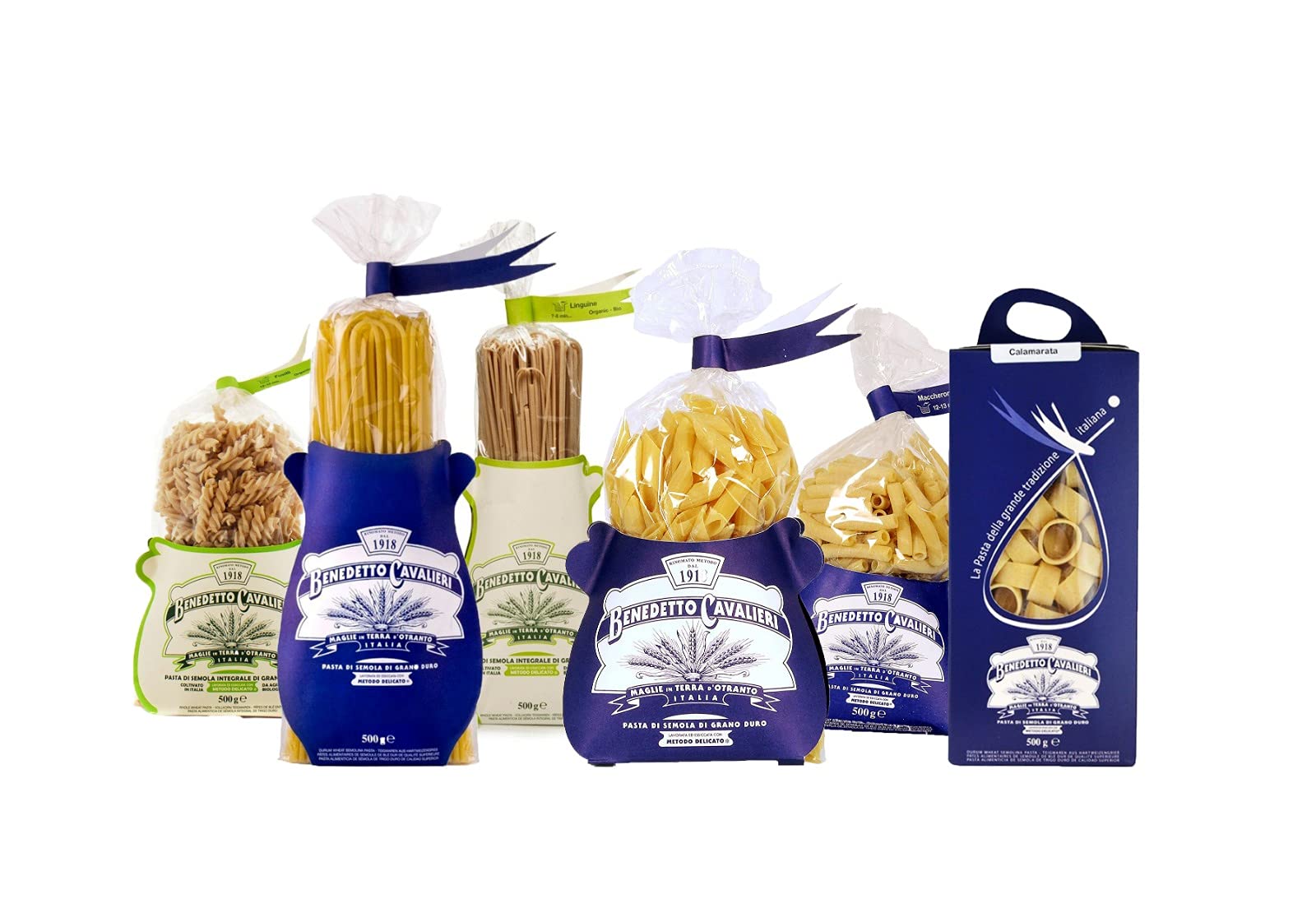 Cavieri Pasta Tasting Set - Calamarata - Bucatini - Maccheroni - Penne Rigate - Whole Wheat Fusilli Flour - Handmade in Italy Benedetto Cavalieri pasta is renowned worldwide for: the rigorous selection of Italian durum wheat grown in the particularly suitable soils of the hills of Puglia and Basilicata. The wheat is cultivated without the widespread and common use of chemical fertilizers that increase yields at the expense of quality. The processing method, defined as "DELICATE," involves: gentle rolling, slow kneading, pressing, and bronze rolling, followed by low-temperature drying. All of this preserves the typical flavor, ensures a completely natural texture, and excellent permeability to seasonings. Finally, the "Delicate Method" guarantees the complete preservation of the valuable nutritional values of high-quality durum wheat, reflecting the passion, care, and continuous pursuit of the highest quality that the Cavalieri family has passed down from generation to generation.