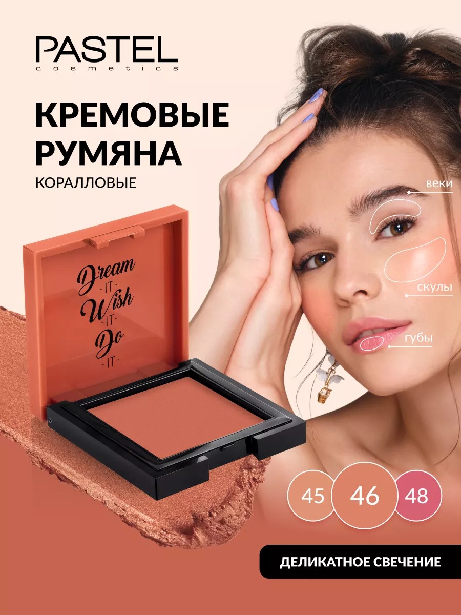 This creamy, coral Cream Blush has a light, creamy texture that glides on perfectly. It instantly adds a healthy, natural, and fresh glow to your cheeks and accentuates your cheekbones. Special ingredients ensure long-lasting wear and regulate sebum secretion. Thanks to its highly pigmented formula and seamlessly blending texture, this liquid blush offers a wide range of effects, from translucent to ultra-bright. Each shade is accompanied by its own motivating slogan on the packaging. Our company is the official distributor of the Pastel Cosmetics brand in the Russian Federation and supplies only genuine products.