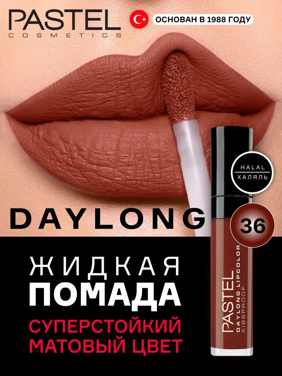Матовая увлажняющая жидкая губная помада Daylong от турецкого бренда халяльной косметики Pastel обладает стойким эффектом на протяжении всего дня. Жидкая формула обеспечивает легкость применения. Матовая текстура самых модных оттенков Daylong сохраняется на губах на протяжении всего дня. Приятный кремовый финиш, роскошная текстура, нежный чарующий аромат, позволит наслаждаться макияжем губ на протяжении всего дня. Данная профессиональная декоративная продукция для макияжа лица Pastel - это халяльная косметика, поэтому Вам не стоит переживать за качество и натуральность продукции. Веганский состав не содержит веществ животного происхождения и глютена.