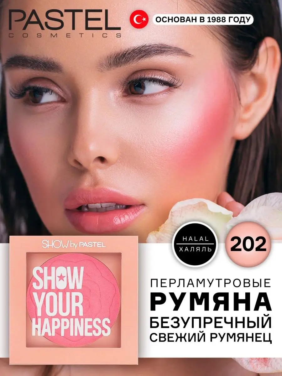 Румяна Show your Happines от турецкого бренда халяльной косметики Пастель идеально подчеркнут форму лица, оставляя на скулах сияющий румянец, придадут коже свежий и молодой вид .Румяна прекрасно гармонируют с тоном кожи, поэтому их можно использовать как замену теней при нанесении на веки. Благодаря сочетанию матовых и перламутровых текстур, теплых и холодных тонов , добавят живости лицу, придадут здоровый и ухоженный вид коже. Данная профессиональная декоративная продукция для макияжа лица Pastel Cosmetics - это халяльная косметика, поэтому Вам не стоит переживать за качество и натуральность. Веганский состав не содержит веществ животного происхождения и глютена.