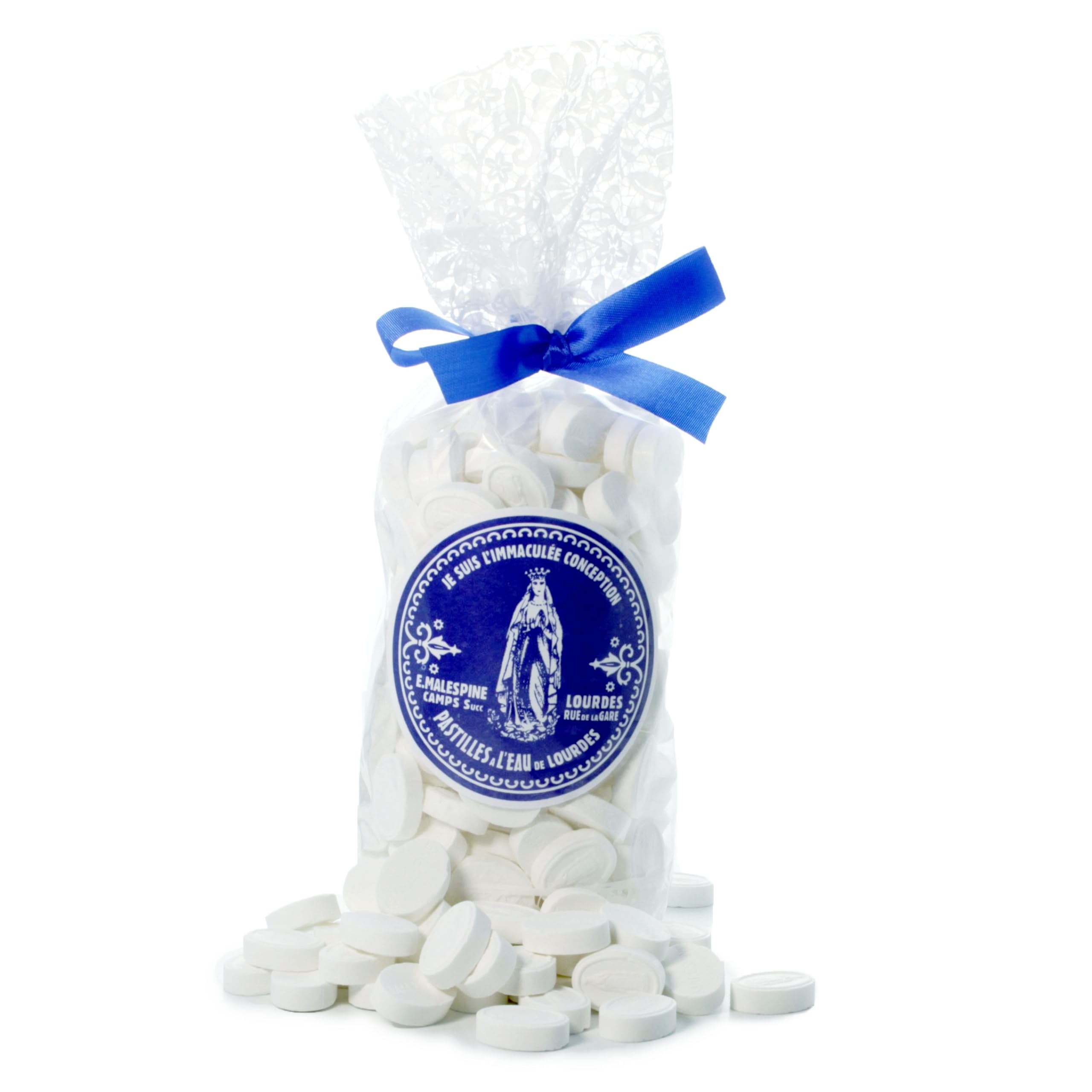 A 500g bag of Malespine mint lozenges made with Lourdes water. These French-made lozenges have a delicate mint flavor and are crafted with genuine water from the Massabielle Grotto in Lourdes. Receive this bag of Lourdes water mint lozenges at home.500g cardboard bag of mint pastilles made with Lourdes water. Genuine Malespine mint pastilles made with water from the Grotto of the Sanctuaries of Lourdes.Sachet contenant 500 g de pastilles menthe Malespine à l'eau de Lourdes. De fabrication française ces pastilles au doux goût de menthe sont confectionnées avec la véritable eau de la Grotte Massabielle de Lourdes. Recevez chez vous ce sachet de pastilles menthe à l'eau de Lourdes.Sachet cartonné de pastilles menthe à l'eau de Lourdes de 500 g. Les véritables pastilles menthe Malespine à l'eau de la Grotte des sanctuaires de Lourdes.Pastilles menthe à l'eau de Lourdes Sachet de 500g - Pastille menthe à l'eau de Lourdes - Culte Chrétien en Eau