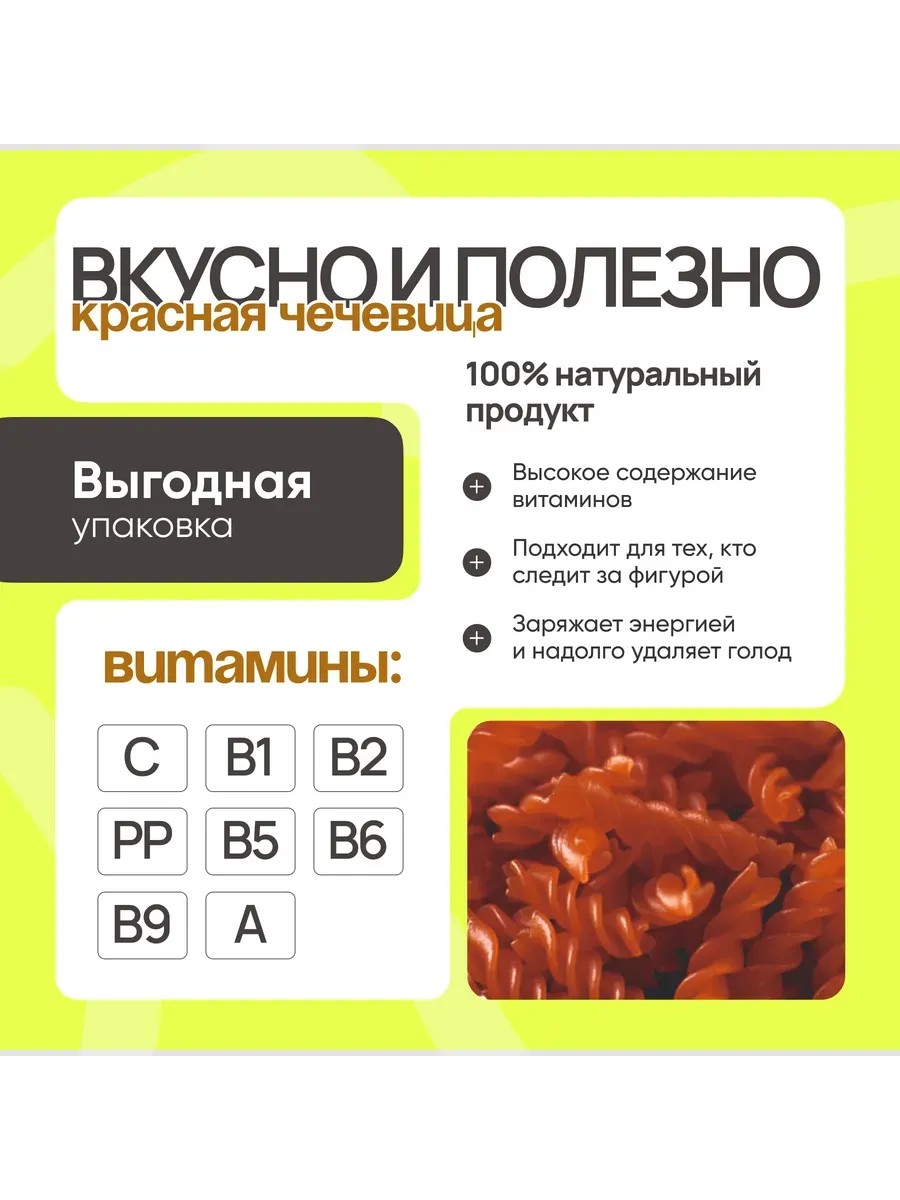 Lentil pasta is made from environmentally friendly ingredients grown in the Altai Mountains. This product can expand a vegan menu and enrich the diet—it contains plant protein and fiber. The spiral shape perfectly holds any sauce and is suitable for main courses and salads. Try lentil pasta and be surprised by the unique flavor! Ingredients: red lentil flour, drinking water. This vegetarian product is suitable for Lenten recipes and for a healthy, balanced diet.