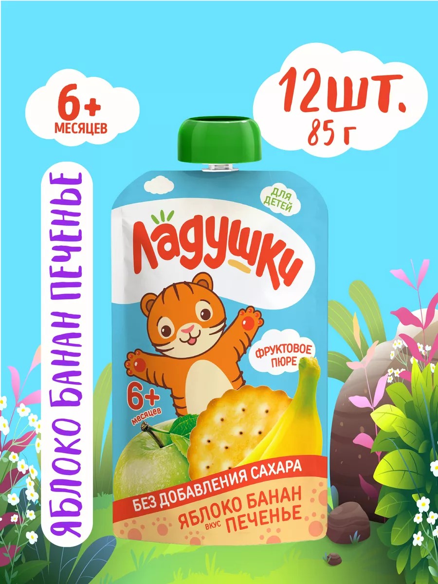 Фруктовое пюре с яблоком, бананом и печеньем Ладушки - натуральный продукт для питания детей старше 6 месяцев. Без сахара, без консервантов, без ГМО, без красителей и искусственных добавок. Для производства детского пюре используются тщательно отобранные фрукты - яблоко и банан. На предприятии ведется строгий контроль качества на всех этапах. Детское пюре фруктовое имеет высокий стандарт качества и сертифицировано по системе эко-продукт. Детское пюре 6 + Яблоко Банан Печенье без сахара вкусная и полезная еда для Вашего ребенка. Пюре из яблок, бананов и печенья содержит полезные пищевые волокна, фруктовые природные сахара и минеральные вещества - калий, кальций. Детское питание Ладушки непременно оценит малыш, мама, папа или няня. Упаковка в пауче 85 г надежно сохраняет пользу и вкус пюре. Удобный дой-пак с крышкой можно купить для дома, детского сада, прогулок, школы или путешествия. Мягкая упаковка пауч - это пакетик детского пюре весом 85 г. В одной коробке 12 штук. Детские пюрешки Ладушки для детей раннего возраста - сделано с любовью к деткам.