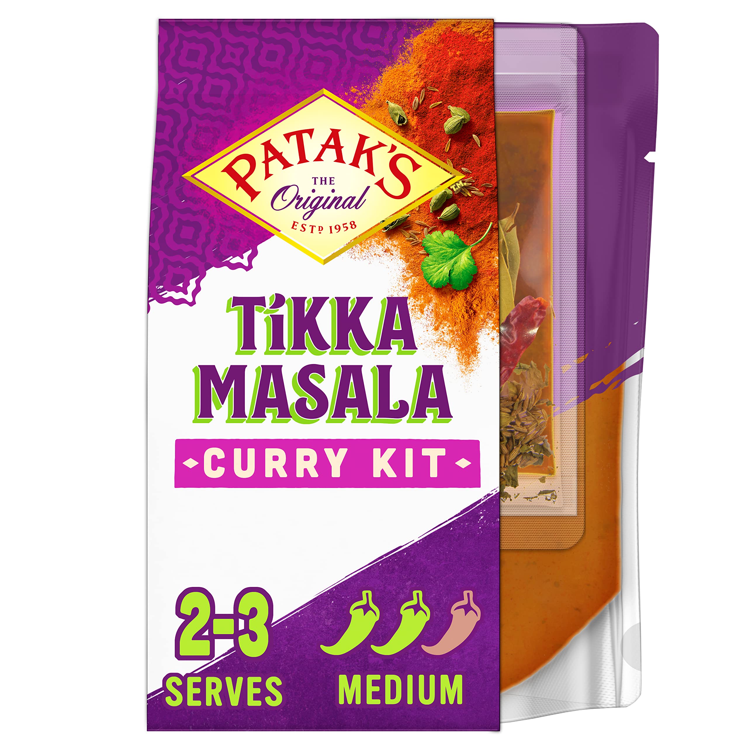 Pataks Tikka Masala 3 Step Curry Kit. Pataks Tikka Masala 3 Step Curry Meal Kit Create a rich, creamy curry with hints of cumin and bay leaf. The Patak's Spice Pastes are made using a blend of carefully selected spices from an original family recipe, making it easy for you to create a delicious curry. INGREDIENTS Tikka Masala Sauce (77 ) [Water, Onion Purée, Single Cream (13 ) (MILK), Concentrated Tomato Paste, Tomatoes [contains Acidity Regulator (Citric Acid)], Rapeseed Oil, Sugar, Ginger Purée, Garlic Purée, Modified Maize Starch, Ground CASHEW NUTS, Salt, Colour (Paprika Extract), Acidity Regulator (Lactic Acid)], Tikka Masala Paste (22 ) [Water, Ground Spices [Turmeric, Paprika, Cumin (0.2 ), Coriander, Spices, MUSTARD Powder], Rapeseed Oil, Tamarind Pulp [Water, Tamarind, Salt, Acid (Acetic Acid)], Salt, Maize Flour, Acids (Acetic Acid, Citric Acid), Garlic Powder, Dried Fenugreek Leaf (0.1 ), Cumin Seed (0.1 ), Paprika Extract, Dried Coriander Leaf], Whole Spices (1 ) [Cumin Seeds (0.3 ), Dried Red Chilli (0.3 ), Green Cardamon (0.2 ), Dried Bay Leaves (0.1 ), Dried Fenugreek Leaf (0.1 )] DIRECTIONS 3 Simple Steps 1 Gently Fry the Whole Spices in Oil 2 Add the Patak's Spice Paste 3 Stir in the Base Sauce and Simmer This product be cooked. SAFETY WARNING sytay away from eye contact MANUFACTURER CONTACT INFORMATION Kiribati Way Leigh Lancashire Wn7 5Rs See moreContains milk mustard. Suitable for vegetarians. No artificial preservatives, colours or flavours. Chilli rating - medium - 2. Create a rich, creamy curry with hints of cumin and bay leaf Chilli rating - medium - 2 No artificial preservatives, colours or flavours Suitable for vegetarians.