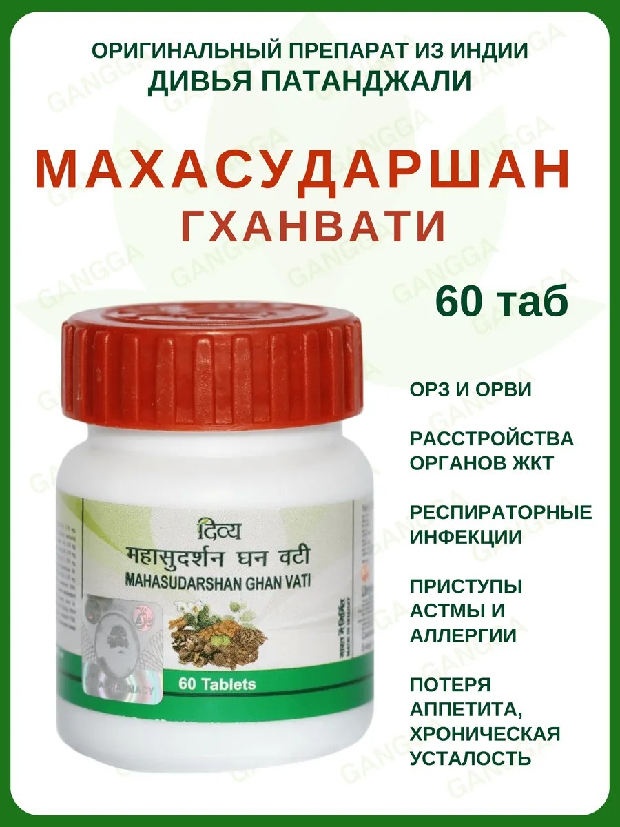 A complex, multi-component preparation (53 herbs) that is highly effective, primarily for gastrointestinal problems. Its effectiveness is due not only to its rich formula but also to its production method: tablets are made not from dried plant powder, but from the dry residue of evaporated plant juice. These preparations (called ghan) have a high concentration of active ingredients. It improves the function of the gastrointestinal tract, liver, and pancreas, facilitates digestion, cleanses the intestines, sanitizes the microflora, acts as a general tonic, choleretic and anthelmintic, and promotes appetite. It relieves dyspeptic disorders and gastrointestinal spasms and is recommended for those who overindulge in sweet or fatty foods. It helps normalize pancreatic function and is used for diabetes, chronic and acute cholecystitis and pancreatitis, as well as gallstones and fatty liver disease. It is prescribed for hyperacid gastric ulcers, heartburn, and pain, as it neutralizes excess acidity, eliminates hydrochloric acid stagnation, and prevents damage to the gastric mucosa. Mahasudarshan Ghanvati is a bitter taste, and bitters relieve inflammation, purify the blood, and completely remove toxins (in viral and bacterial infections). The preparation effectively reduces fever and tones after the temperature drops. It has diuretic properties. One of the actions of the preparation (due to its bitter taste) is cleansing the eyes and improving visual acuity. Directions for use: Adults: 1-2 tablets 2-3 times daily immediately after meals with warm water or milk. Children over 6 years: 1 tablet 1-2 times daily immediately after meals. Children 3-6 years: 1/2 tablet once daily after lunch. The recommended course of treatment is from early spring to late fall. Contraindications: Individual intolerance to any of the ingredients. This is not a medicinal product. Before starting treatment, we recommend consulting an Ayurvedic specialist to determine a tailored regimen.