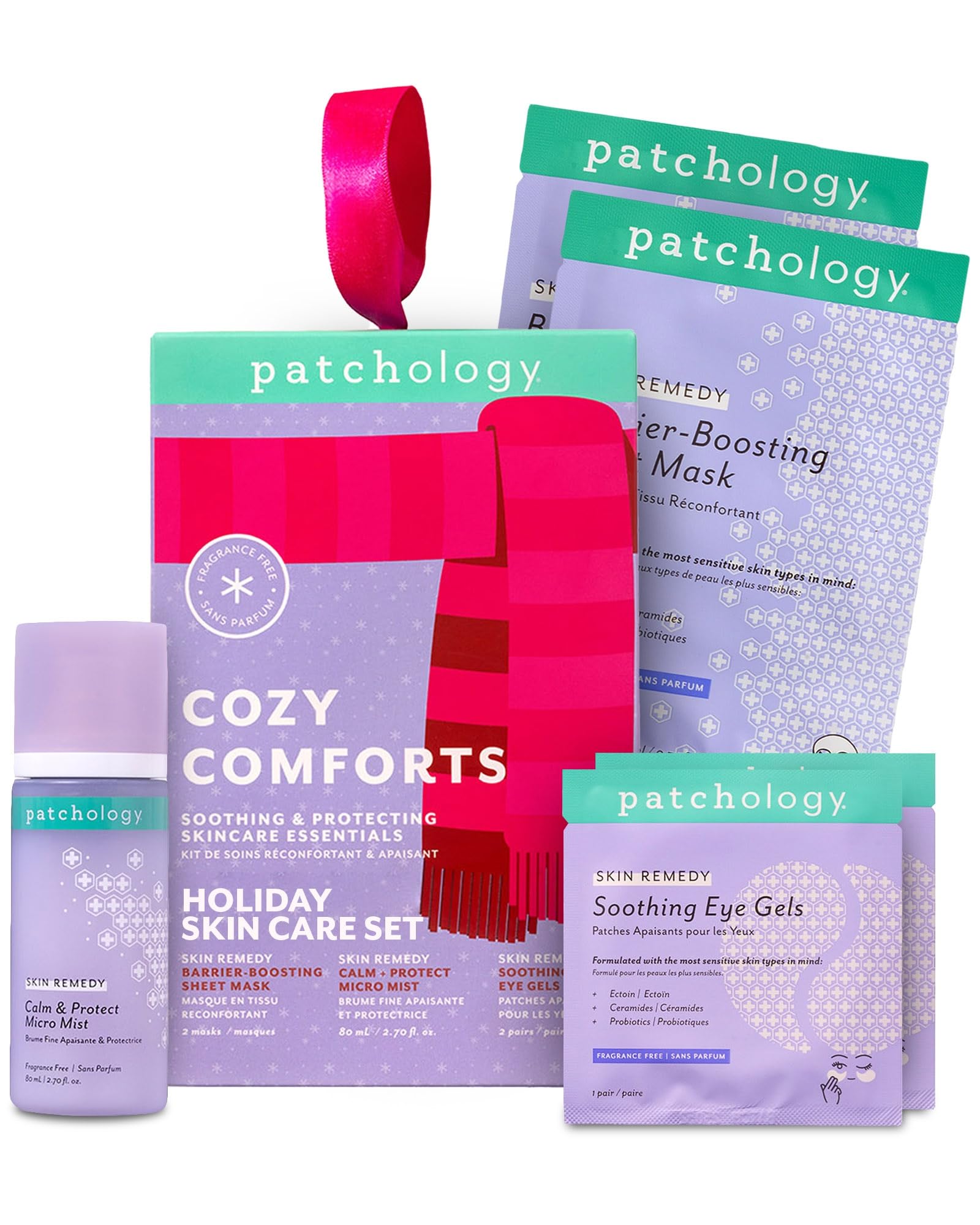 Patchology Cozy Comforts Holiday Skincare Gift Set - Soothing Under Eye Patches Barrier-Boosting Hydrating Sheet Masks & Calming Mist - Limited Edition Winter Christmas Gifts & Stocking Stuffers