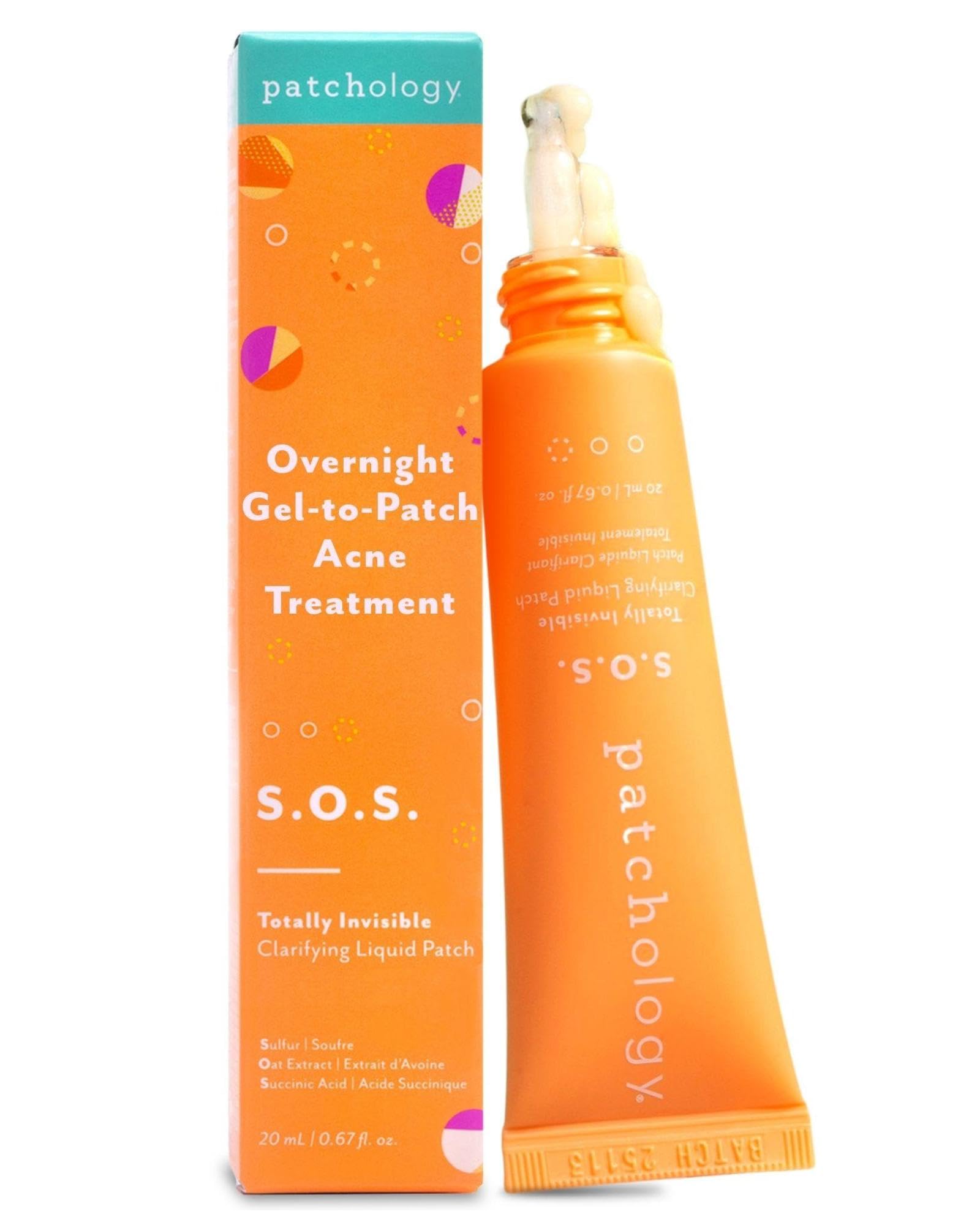 SAFE VERSATILE: Makeup-safe, pregnancy-safe, and effective on face and body acne (yup, it serves as bacne treatment for women, too!), Patchology SOS is your reliable go-to acne treatment for clearer, refined skin wherever you need it. CLEAR SKIN, STAT: Quick-drying and effective, SOS helps visibly refine bumps and keep pores fresh, giving you a smoother-looking complexion without the wait. SOOTHE BALANCE: Infused with oat extract to calm and comfort, this lightweight formula supports skin's natural balance so it feels nourished while targeting breakouts. INVISIBLE GEL-TO-PATCH: A unique gel that dries clear, creating an invisible patch effect. Perfect under makeup during the day or while you sleep — no mess, just stress-free skin care. BANISH BUMPS FAST: Meet Patchology SOS – the fast, effective solution you need for clearer skin when time is of the essence. Powered by 2.9 sulfur and succinic acid, this sulfur acne treatment for face targets blemishes quickly, leaving your skin smooth with no downtime.