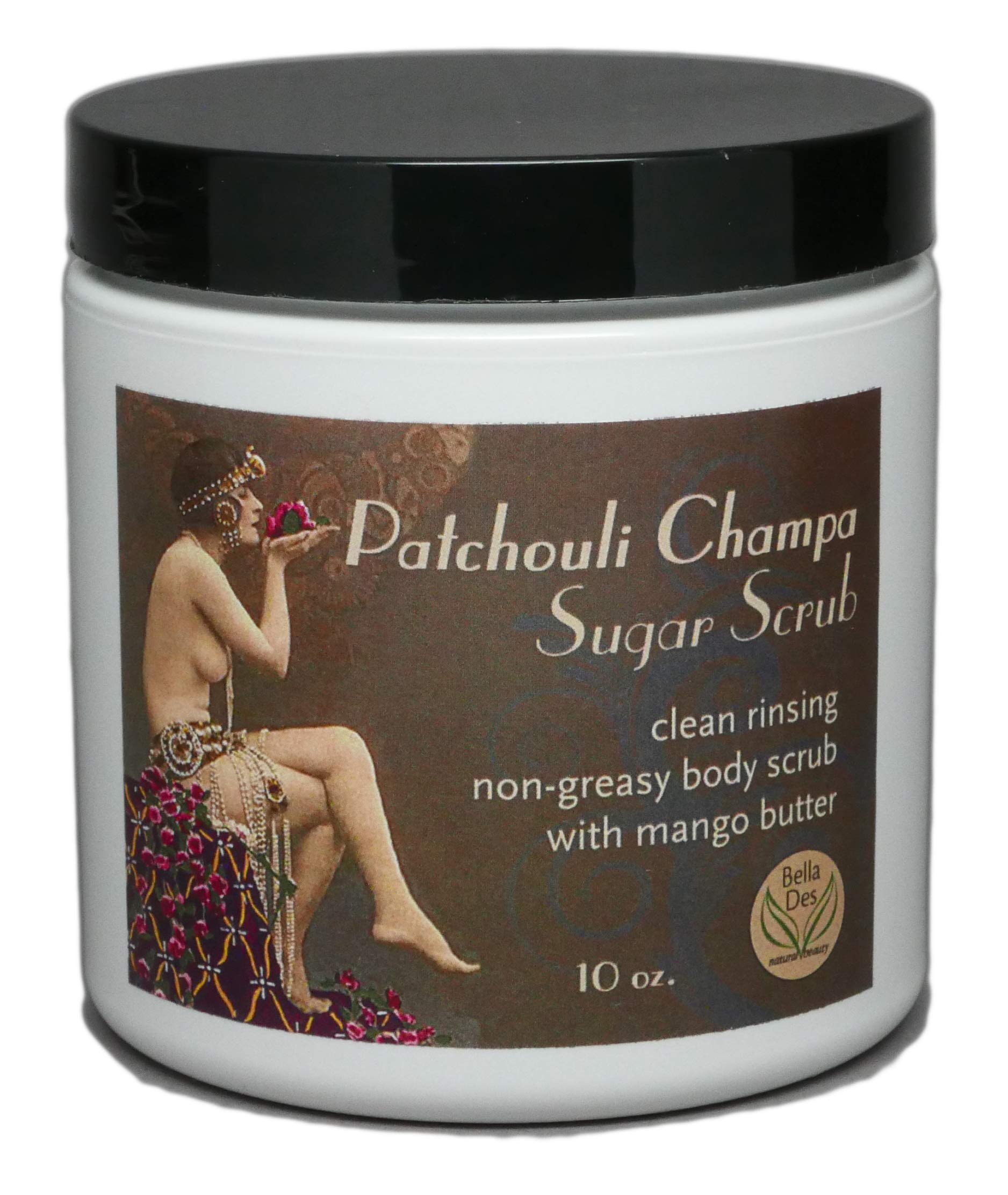 Patchouli Champa Exfoliating Sugar Scrub | Non-Greasy with Moisturizing Mango Butter and Patchouli Essential Oil | 10 ounces net wt | by Bella Des Natural Beauty