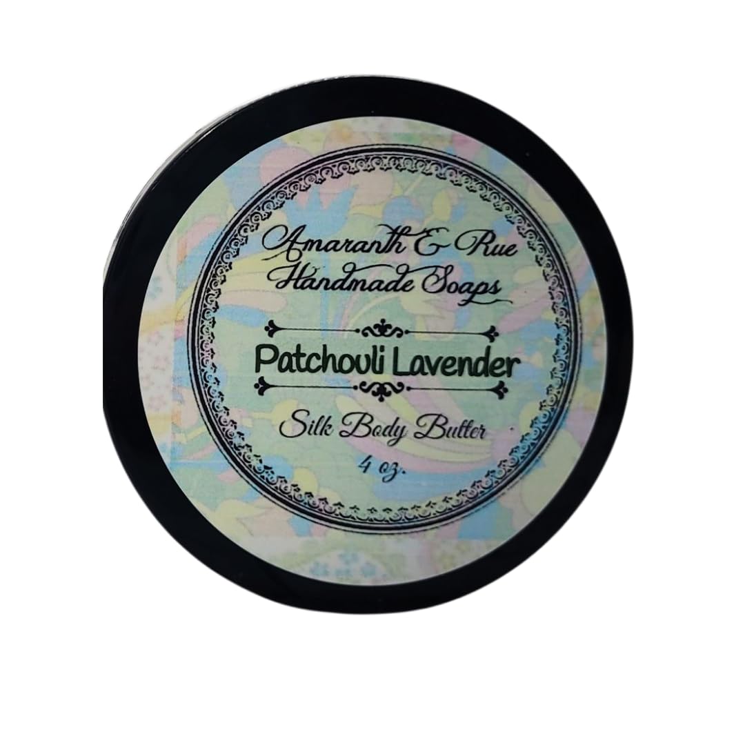 4 ounces of thick creamy artisan Silk Body Butter by Amaranth Rue richly scented with Patchouli and Lavender essential oil. Patchouli Lavender blends the best of both scents, relaxing and earthy . This thick formula is enriched with organic natural silk proteins and vitamin E for a truly skin enriching experience. It is great for dry hands, feet, knees and elbows, or all over for a truly hydrating moisturizing experience.