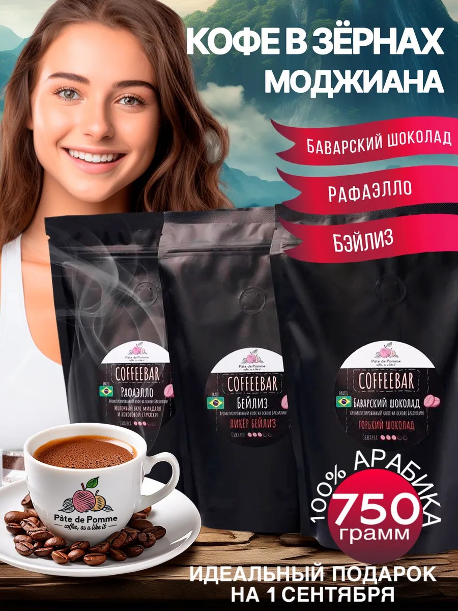 Кофе в зернах набор вкусов подарочный, арабика 100% – это настоящая находка для ценителей ароматного напитка. Вес набора 750 грамм, 3х250. Если вы ищете продукт высокого качества, который порадует вас свежестью и насыщенным вкусом, то наш кофе Pate de Pomme идеально подойдет для вас. Средняя степень обжарки, medium. В наборе ассорти из 3-х видов. Вкусовые оттенки: Баварский шоколад - горький шоколад. Бейлиз - ликер бейлиз. Рафаэлло - молочный вкус миндаля и кокосовой стружки.