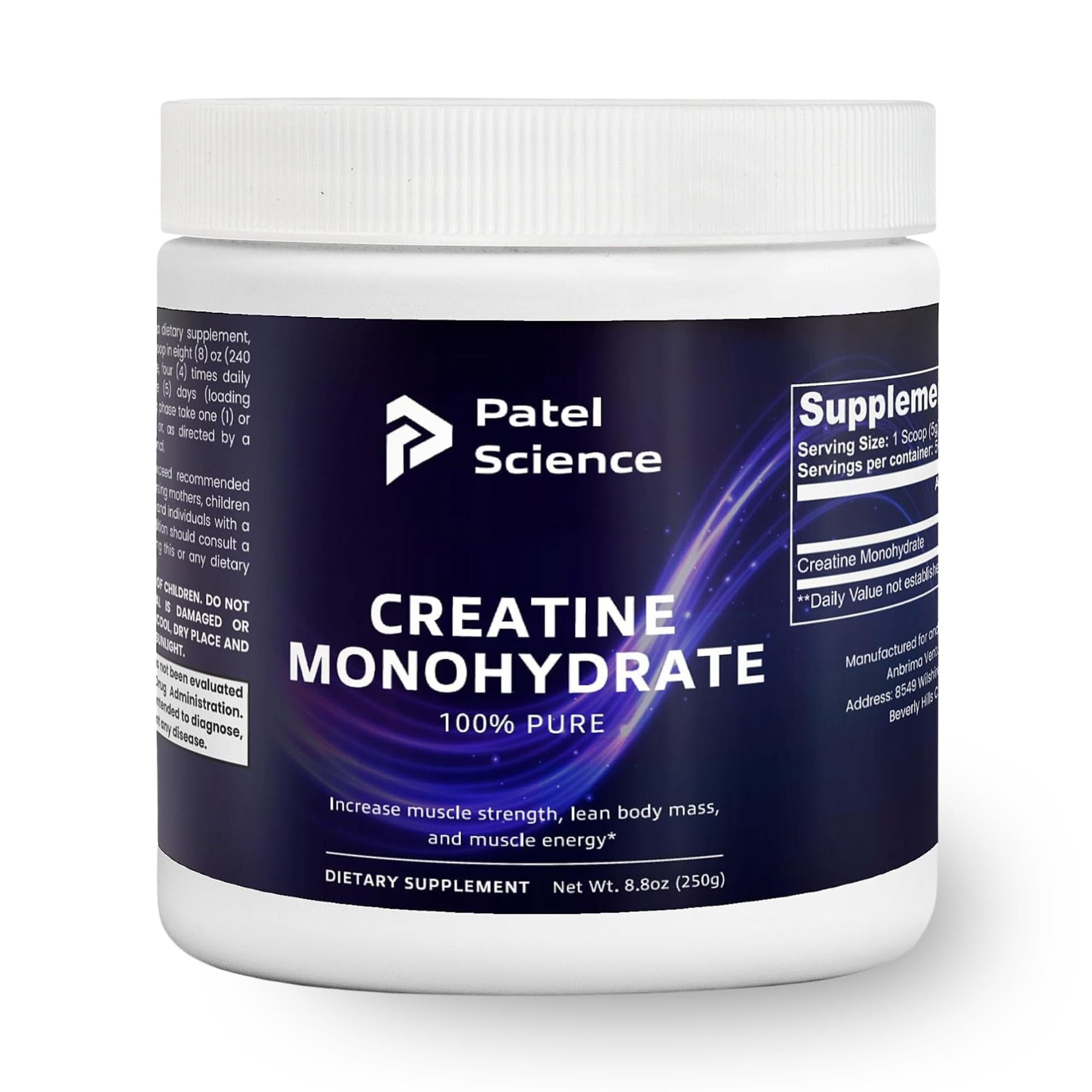 Patel Science Creatine Monohydrate - Pure Creatine for Women & Men Mixable Powder for Fitness & Gym Lean Body Mass Gainer - Unflavored 8.8oz (250g)
