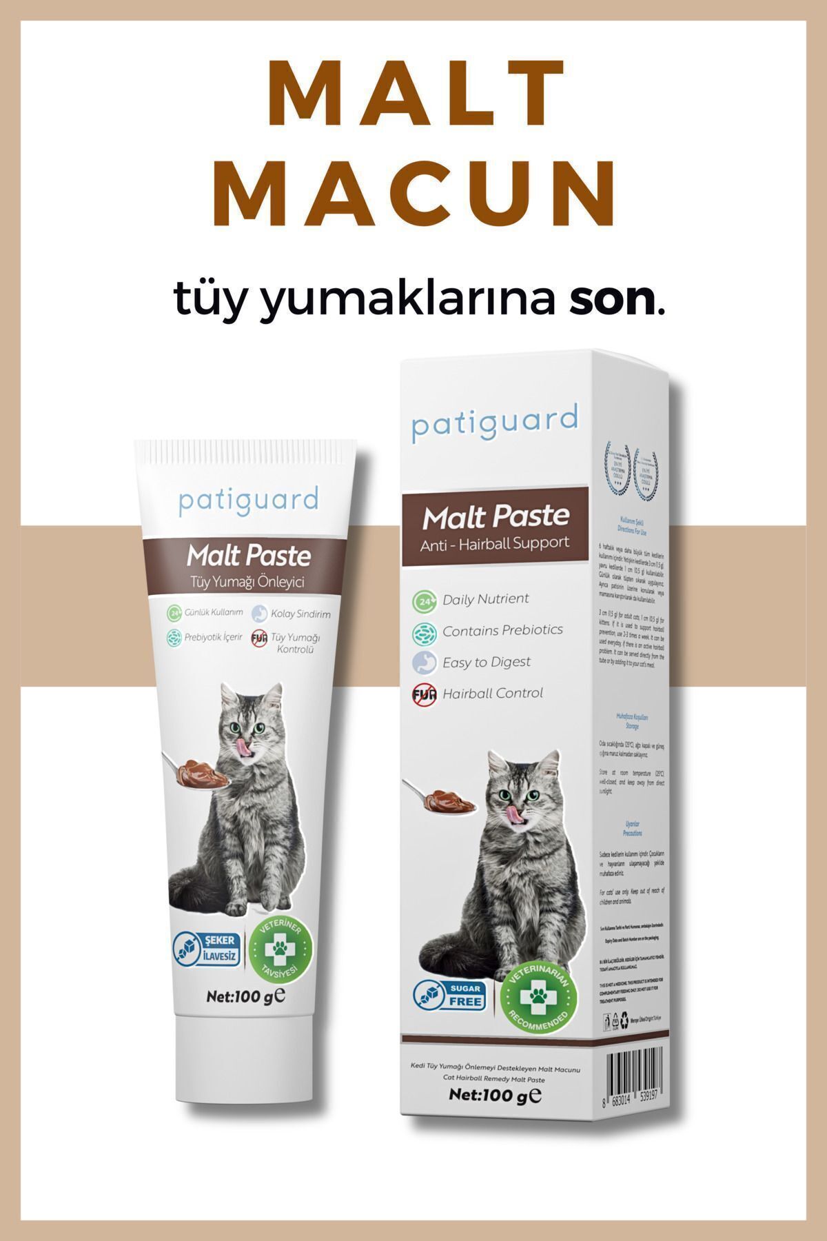 - Veterinerlerin önerdigi Patiguard Anti - Hairball Malt Macun, seker içermemesi sayesinde de oldukça sagliklidir.
