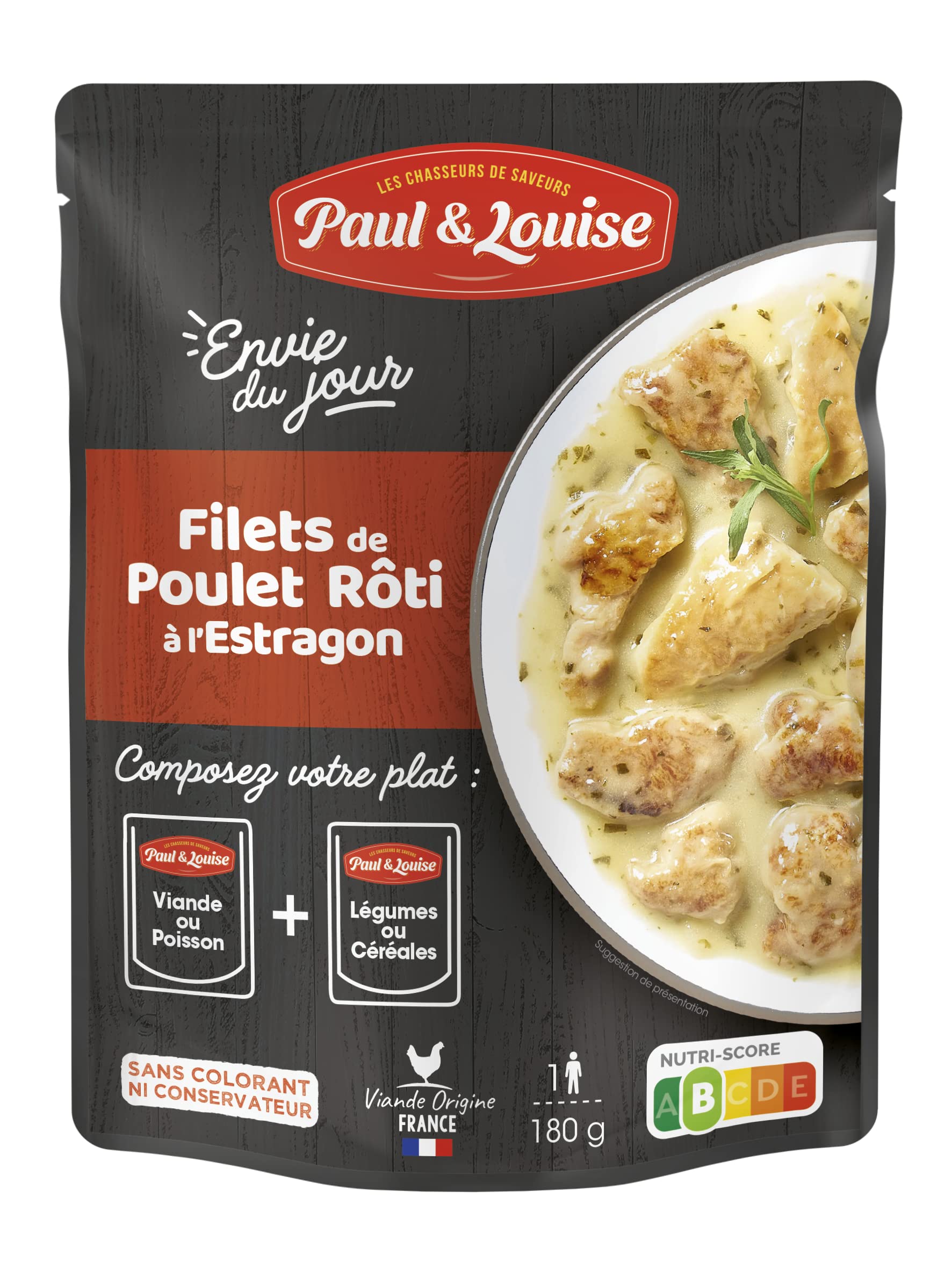The "ENVIE DU JOUR" range by Paul Louise allows you to personalize your meal with 10 protein recipes and 10 legume recipes. Choose 2 sachets and create your own dish. 20 recipes, 100 possible choices! INGREDIENTS Pieces of cured and roasted chicken fillet 50 (chicken fillet (origin France), water, starch, salt, dextrose), water, pasteurized fresh cream, white wine, unsalted butter, shallots, starch, tarragon 1 , Dijon mustard, concentrated lemon juice, salt. Possible traces of cereals containing gluten, shellfish, fish, soy, and celery INSTRUCTIONS FOR USE Store at room temperature Store at room temperature - Long shelf life. Recipe prepared in our Saint Sébastien Sur Loire workshops. Bag to be combined with one of our "ENVIE DU JOUR" side dish bags. With the 20 recipes in our range, you can make 100 different dishes. 100 French Meat. Roasted chicken fillets with tarragon bag 180g - Nutriscore B. La gamme "ENVIE DU JOUR" by Paul Louise vous propose de personnaliser votre repas grâce à 10 recettes de protéines et 10 recettes de légumineuses. Choisissez 2 sachets et composez votre plat. 20 recettes, 100 choix possibles ! INGRÉDIENTS Morceaux de filet de poulet traités en salaison et rôtis 50 (filet de poulet (origine France), eau, amidon, sel, dextrose), eau, CREME fraiche pasteurisée, vin blanc, BEURRE doux, échalottes, amidon, estragon 1 , MOUTARDE de Dijon, jus de citron concentré, sel. Traces éventuelles de CEREALES contenant du GLUTEN, CRUSTACES, POISSON, SOJA, et CELERI MODE D'EMPLOI A conserver à température ambiante Stockage à température ambiante - Longue conservation. Recette cuisinée dans nos ateliers de Saint Sébastien Sur Loire. Sachet à combiner avec un de nos sachets d'accompagnements "ENVIE DU JOUR". Avec les 20 recettes de notre gamme , possibilité de réaliser 100 plats différents. 100 Viande Française. Sachet Filets de poulet rôti à l'estragon 180g - Nutriscore B.