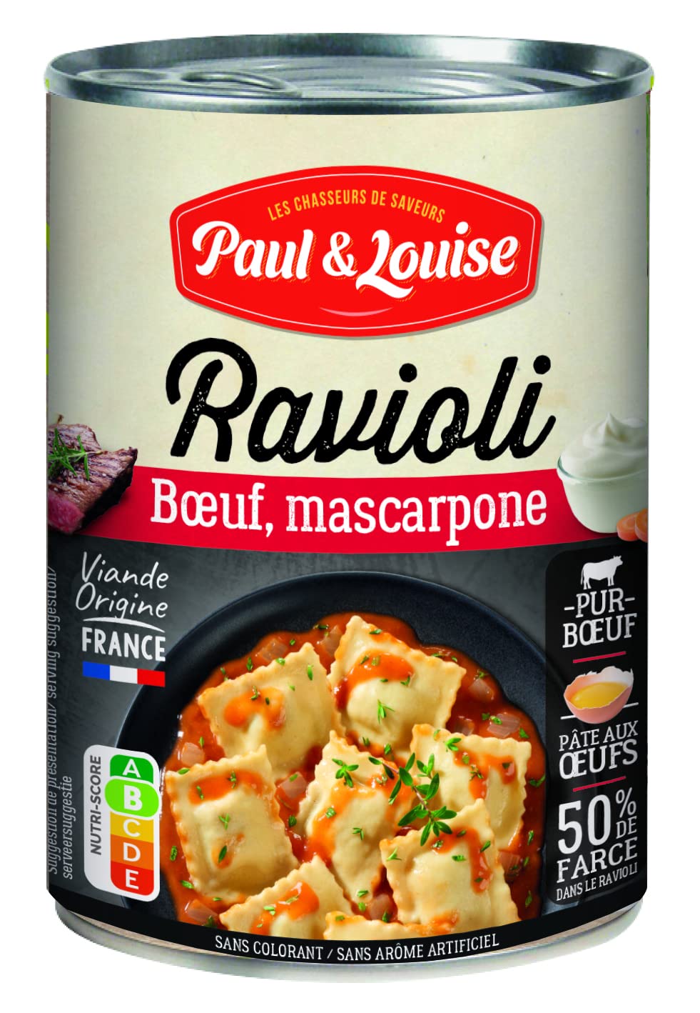 Paul Louise, the Flavor Hunters, went to taste the Italian Dolce Vita. They brought back in their travel diary authentic Ravioli recipes. Discover them through this new range of recipes, each one tastier than the last. "Delizioso!" INGREDIENTS Water, durum WHEAT semolina 7.7 , beef 7.5 (origin France), tomato paste 7 , onions, breadcrumbs (contains GLUTEN), MASCARPONE 2.5 , aromatic plants, whole EGGS, salt, WHEAT flour, starch, carrots, sugar, rapeseed oil, sugar. Ravioli: 21 of the recipe. The stuffing represents 50 of the weight of the ravioli when prepared. INSTRUCTIONS FOR USE In the microwave Pour the contents into a suitable container Heat for 2 to 3 minutes depending on the power of the oven In a saucepan Pour the contents into a saucepan Heat over very low heat for approximately 6 minutes NUTRISCORE B. No artificial colors, no preservatives. 50 filling in the ravioli. Egg dough. Cooked double-sheet ravioli. Paul Louise, les Chasseurs de Saveurs, sont allés goûter la Dolce Vita Italienne. Ils ont ramenés dans leur carnet de voyage d'authentiques recettes de Raviolis. Découvrez-les à travers cette nouvelle gamme de recettes plus savoureuses les unes que les autres. « Delizioso ! » INGRÉDIENTS Eau, semoule de BLÉ dur 7.7 , viande de bœuf 7.5 (origine France), concentré de tomates 7 , oignons, chapelure (contient GLUTEN), MASCARPONE 2.5 , plantes aromatiques, ŒUFS entiers, sel, farine de BLÉ, amidon, carottes, sucre, huile de colza, sucre. Ravioli : 21 de la recette. La farce représente 50 du poids du ravioli à la mise en œuvre. MODE D'EMPLOI Au micro-ondes Verser le contenu dans un récipient adapté Chauffer 2 à 3 minutes selon la puissance du four Dans une casserole Verser le contenu dans une casserole Réchauffer à feu très doux 6 minutes environ NUTRISCORE B. Sans colorant, Sans conservateur. 50 de farce dans le ravioli. Pâte aux œufs. Ravioli à double feuille cuisinés.
