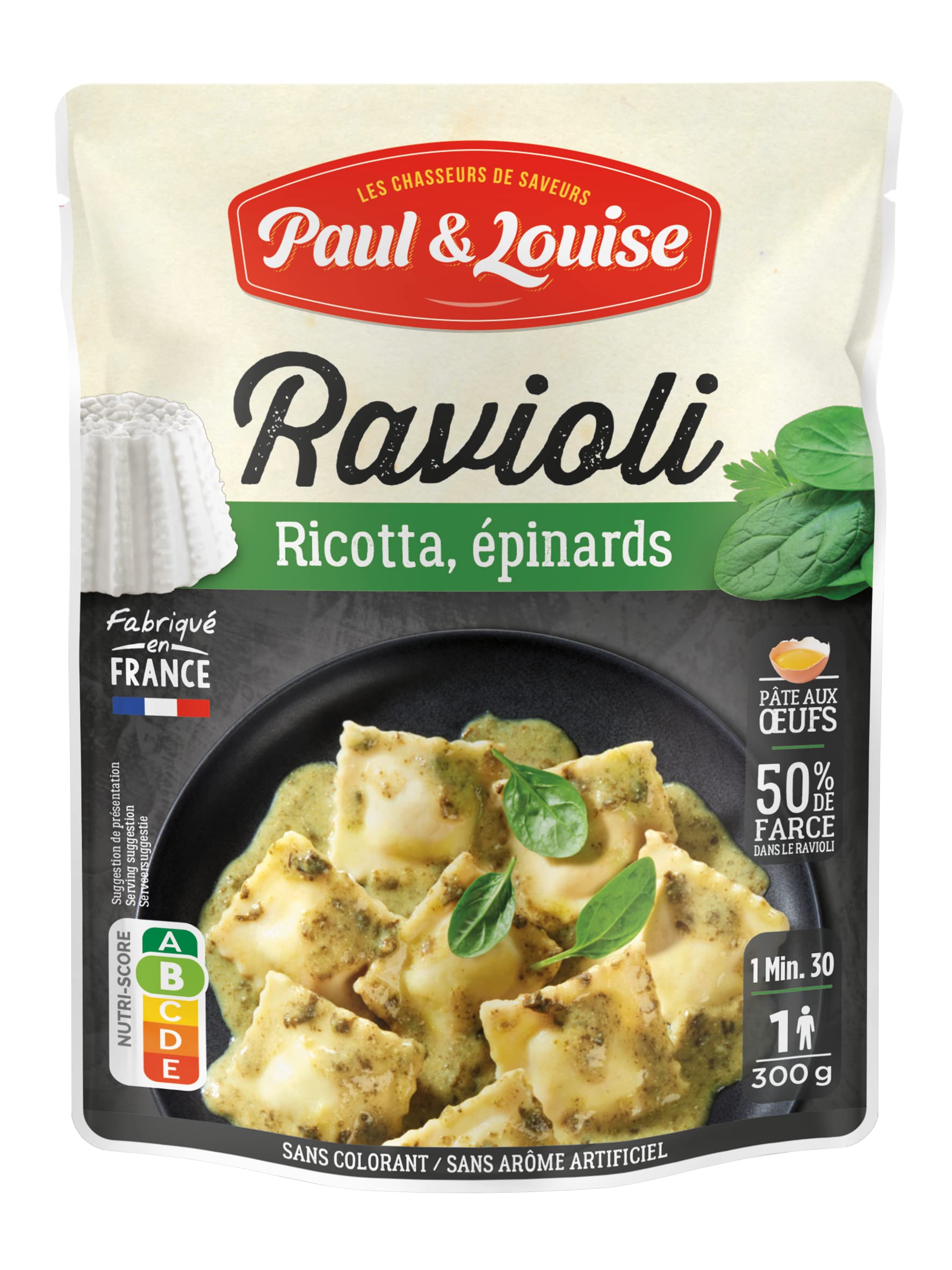Paul Louise, the Flavor Hunters, went to taste the Italian Dolce Vita. They brought back authentic Ravioli recipes in their travel journal. Discover them through this new range of recipes, each one tastier than the last. "Delizioso!" INGREDIENTS Water, spinach 11.9 , durum WHEAT semolina 9.8 , RICOTTA 7.2 , CREAM, breadcrumbs (contains GLUTEN), PARMESAN PDO, whole EGGS, spices and aromatic plants, salt, WHEAT flour, starch, rapeseed oil, ground CELERY. Ravioli: 26.7 of the recipe. The stuffing represents 50 of the weight of the ravioli when prepared. INSTRUCTIONS FOR USE In the microwave Place the open bag at the top of the oven at full power. Be careful, the bag will be hot when removed. Enjoy. 10 minutes in a bain-marie Immerse the sealed bag in simmering water for 10 minutes. Run it under cold water before opening. Be careful of the heat when opening the bag. NUTRISCORE B. No artificial colors, no preservatives. 50 filling in the ravioli. Egg dough. Cooked double-sheet ravioli. Paul Louise, les Chasseurs de Saveurs, sont allés goûter la Dolce Vita Italienne. Ils ont ramenés dans leur carnet de voyage d'authentiques recettes de Raviolis. Découvrez-les à travers cette nouvelle gamme de recettes plus savoureuses les unes que les autres. « Delizioso ! » INGRÉDIENTS Eau, épinards 11.9 , semoule de BLE dur 9.8 , RICOTTA 7.2 , CREME, chapelure (contient GLUTEN), PARMESAN AOP, OEUFS entiers, épices et plantes aromatiques, sel, farine de BLE, amidon, huile de colza, CELERI moulu. Ravioli : 26.7 de la recette. La farce représente 50 du poids du ravioli à la mise en œuvre MODE D'EMPLOI Au micro-ondes Placer le sachet ouvert en haut dans le four à pleine puissance. Attention, le sachet est chaud à la sortie. Dégustez. 10 minutes au bain marie Plonger le sachet fermé dans une eau frémissante durant 10 minutes Passez-le sous l'eau froide avant de l'ouvrir. Attention à la chaleur lors de l'ouverture du sachet NUTRISCORE B. Sans colorant, Sans conservateur. 50 de farce dans le ravioli. Pâte aux œufs. Ravioli à double feuille cuisinés.
