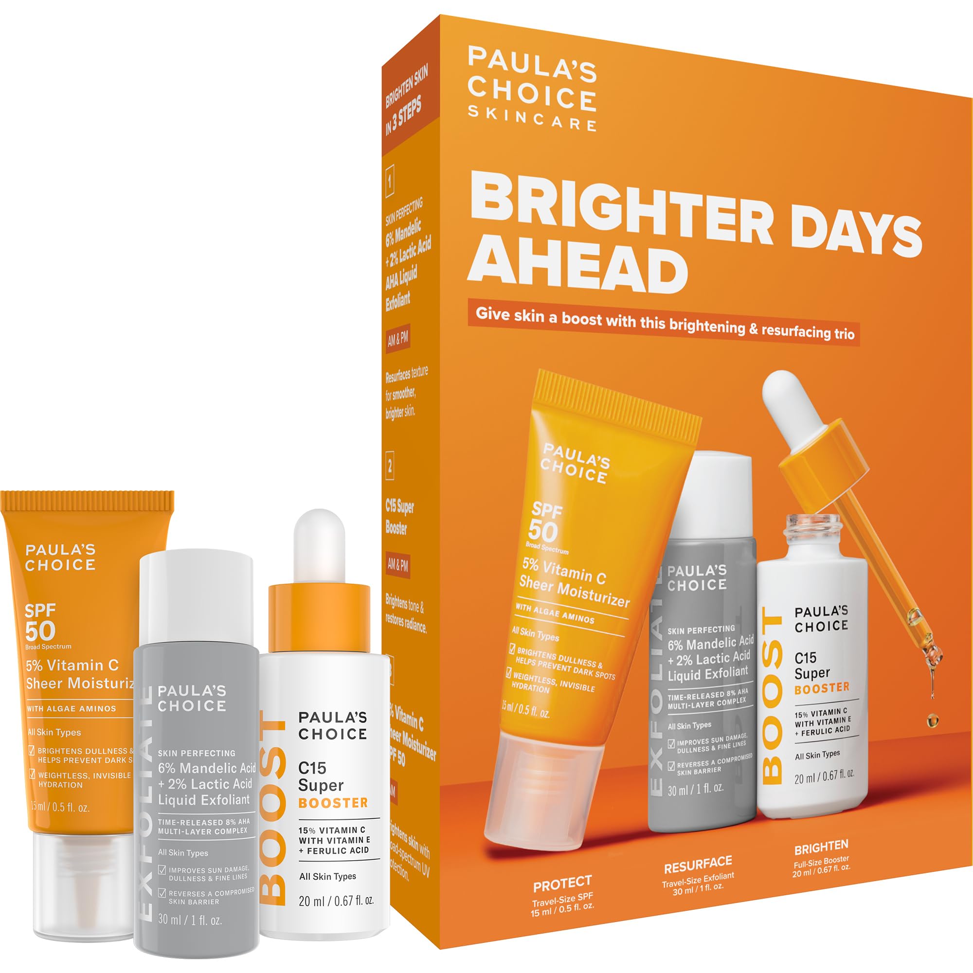 Paula's Choice Brighter Days Ahead Kit Vitamin C and AHA Trio Includes Travel Size C5 SPF Face Sunscreen Mandelic Acid Exfoliant C15 Vitamin C Booster Serum Brightening & Resurfacing 3-Piece Set