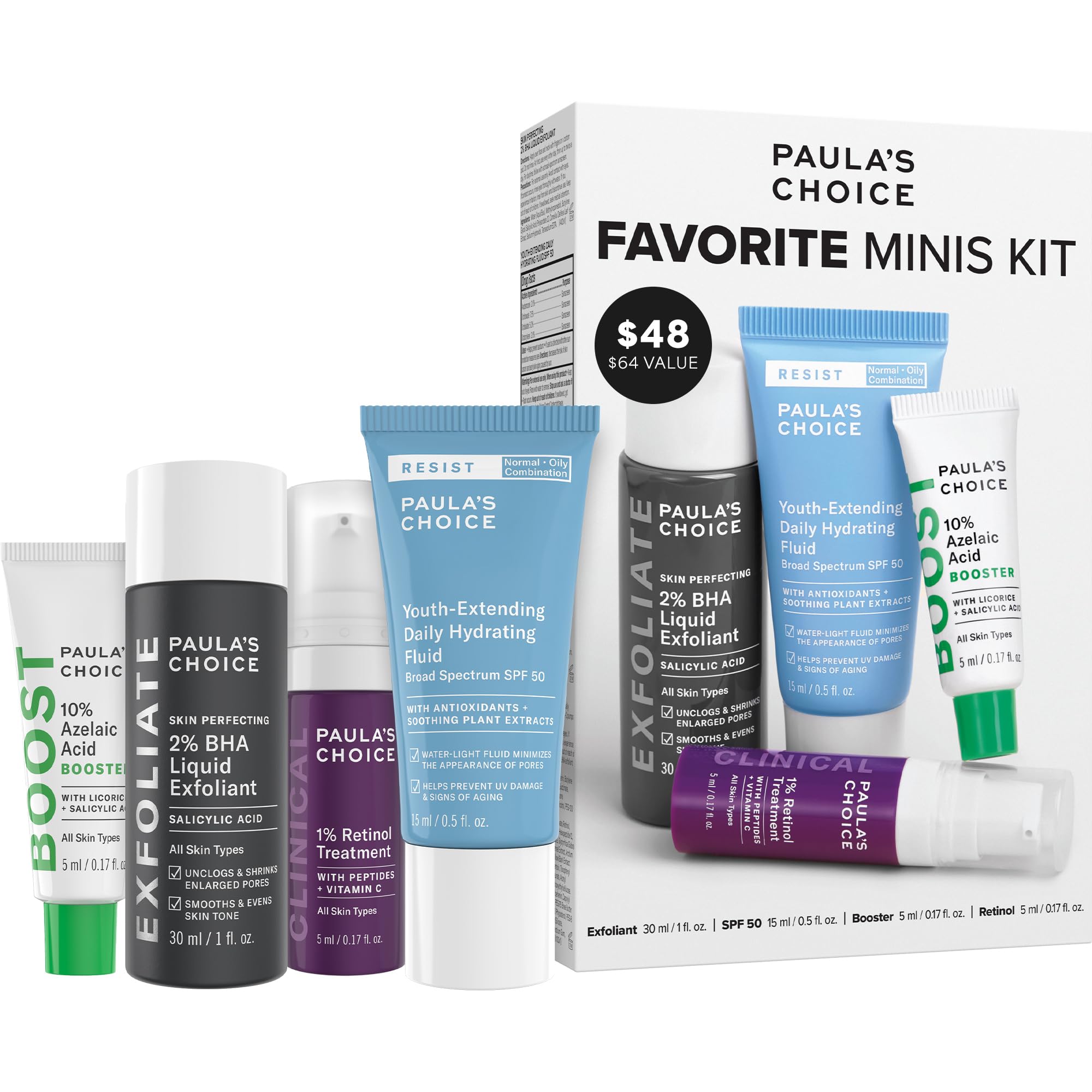 Paula's Choice Favorites Mini Kit 4 Piece Set Includes 2% BHA Exfoliant 1% Retinol Treatment 10% Azelaic Acid Booster Youth Extending SPF 50 Moisturizer Travel Skin Care Set for Glowing Skin