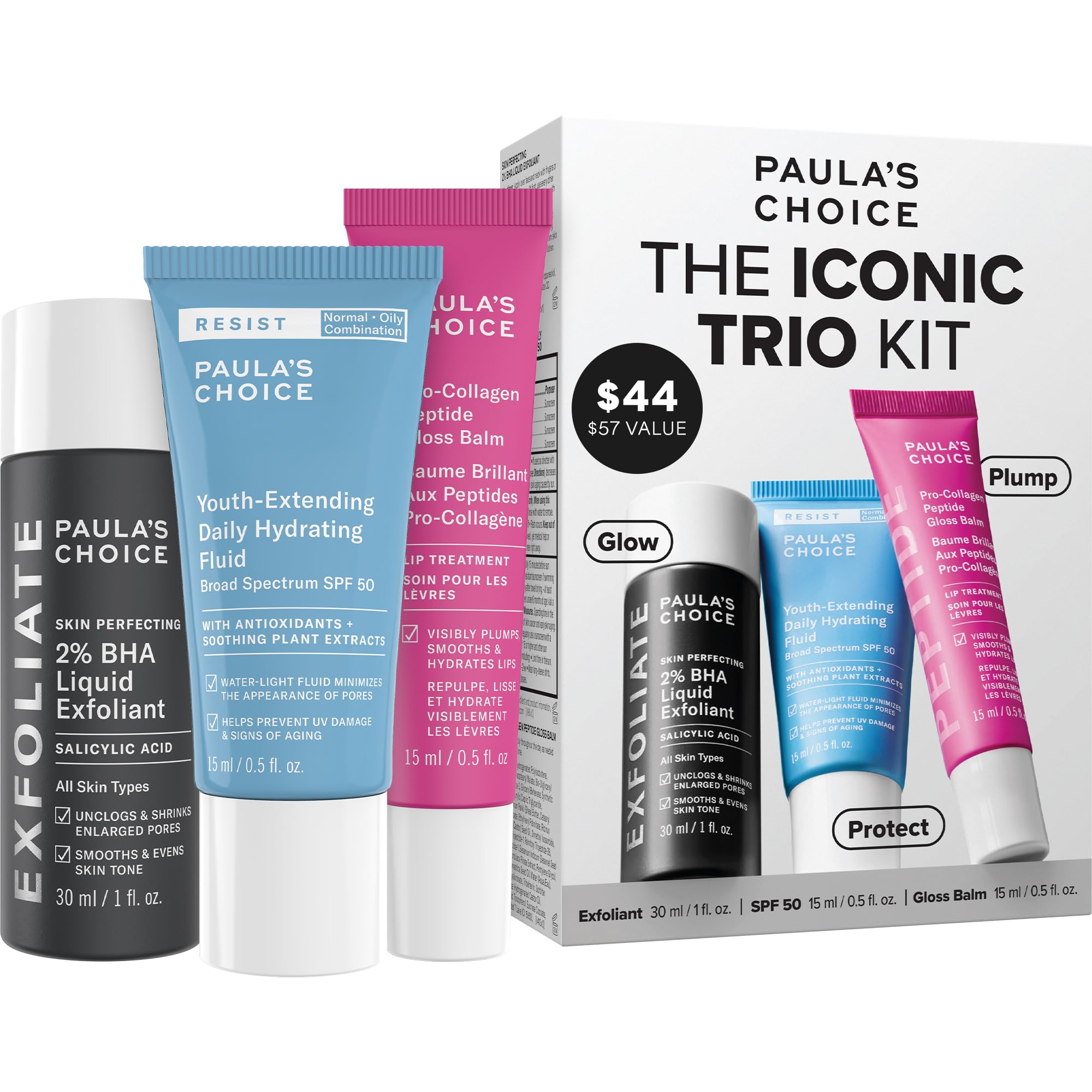 Paula s Choice The Iconic Trio Kit Travel 2% BHA Liquid Exfoliant Travel SPF 50 Moisturizer Full Sized Peptide Gloss Balm Complete Glow and Lip Care Set