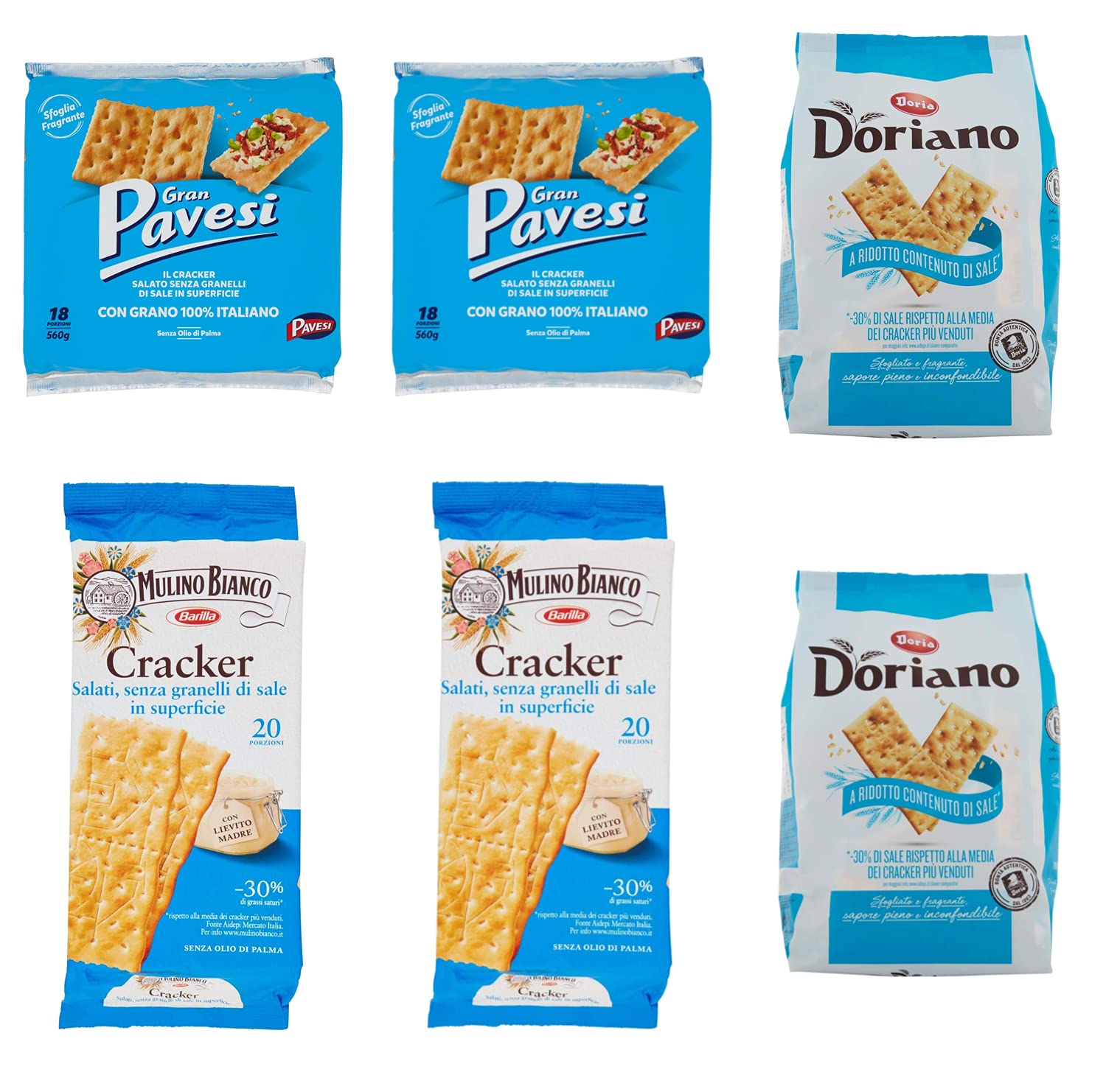 Pavesi 2 Gran Pavesi crackers with less salt 560g + 2 Mulino Bianco crackers with less salt 500g + 2 Doria Doriano crackers with less salt