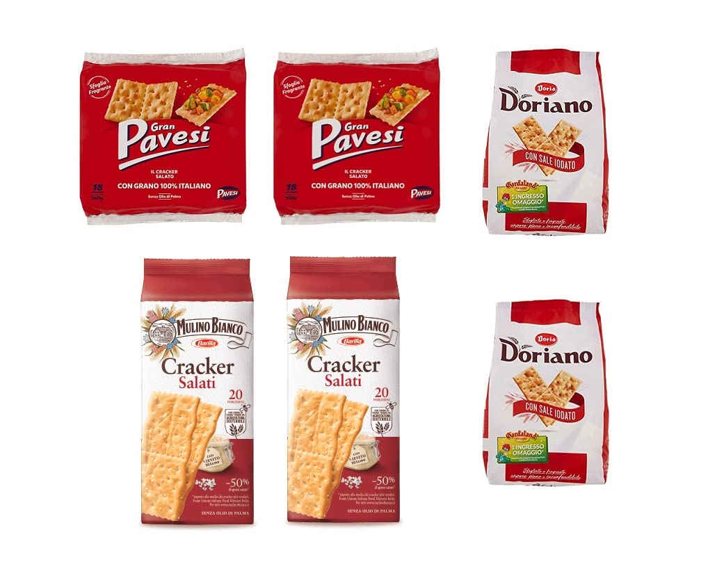 Ingredients: 95g wheat flour (per 100g) - Sunflower oil, 2.1 salt - Barley and corn malt extract - Acidity regulator: sodium bicarbonate, barley malt flour - 0.5 yeast (wheat), yeast. May contain traces of: nuts, milk, soy, and eggs. The highlighted ingredients may cause reactions in people with allergies or intolerances. Free from: flavorings, palm oil, coloring additives, hardened fats, GMO ingredients. Per 100g: Energy 1845 kJ – 439 kcal - Fat 13g of which saturates 1.6g, Carbohydrate 68g of which sugars 2.5g, Niacin 4.8g, Protein 10g, Salt 2.25g. INGREDIENTS 95g wheat flour (per 100g), sunflower oil, 2.1 salt, barley and corn extract, acidity regulator: sodium bicarbonate, barley malt flour, 0.5 wheat yeast, yeast. May contain traces of: nuts, milk, soy, and eggs.2 x Gran Pavesi Crackers Teneur en sel 560 g 2 x Mulino Bianco Crackers 500 g 2 x Doria Doriano CrackersDESCRIPTION DU PRODUIT DESCRIPTION DU PRODUIT Ingrédients : 95 g de farine de blé (produit sur 100 g) - Huile de tournesol 2,1 de sel - Extrait d'orge et de malt de maïs - Régulateur d'acidité : bicarbonate de sodium, farine de malt d'orge - 0,5 de levure de maternité (blé), levure. Il peut contenir des traces de : noix, lait, soja et œufs. Les ingrédients mis en valeur peuvent provoquer des réactions chez les personnes allergiques ou intolérantes. Sans : arômes, huile de palme, additifs colorants, matières grasses durcies, ingrédients OGM pour 100 g : énergie 1845 kJ – 439 kcal - Matières grasses 13 g dont acides gras saturés 1,6 g , hydrate de carbone 68 g dont sucre 2,5 g. N 4,8 g Protéine 10 g Sel 2,250 g. INGRÉDIENTS 95 g de farine de blé (produit sur 100 g) huile de tournesol, 2,1 de sel, extrait d'orge et de maïs, régulateur d'acidité : bicarbonate de sodium, farine de malt d'orge, 0,5 levure de maternité (blé), levure. Il peut contenir des traces de : noix, lait, soja et œufs.